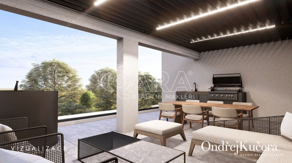 Tento apartmán 3+kk s celkovou výměrou 176,5 m² se nachází ve třetím patře a má vše, co potřebujete k pohodlnému životu u moře. Samotná obytná plocha 79,1 m² působí útulně a prakticky i díky dvěma koupelnám. Skutečným bonusem je soukromá střešní nekrytá terasa 40,4 m² s velkým úložným prostorem a samostatnou toaletou (19,4 m²) , kam se dostanete po točících schodech ze své 34,2 m² velké terasy s přístupem z obývacího pokoje. Jde o prostory, kde můžete snídat, večer grilovat a po celý den jen tak odpočívat. Navíc získáte vlastní úložný prostor 3,4 m² a jedno garážové stání v přízemí domu.