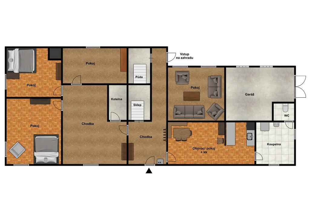 V přízemí domu jsou čtyři samostatné pokoje + velký obývací pokoj s kuchyňským koutem, dvě chodby, koupelna s vanou, samostatné WC a prostor bývalé kotelny (samostatná místnost). V podkroví je velký půdní prostor, přístupný po vnitřním schodišti. Pod domem jsou prostorné sklepy. Část přízemí je garáž – dílna. Na zahradě je pergola a další samostatný sklep. Dům je napojen na obecní vodovod, má plynovou přípojku, septik a elektřinu 230/400V. Topení je ústřední na centrální plynový kotel. Jedná se o zděnou stavbu v dobrém technickém stavu. Zahrada je okrasná a udržovaná. Část pozemku je oplocena, všechny pozemky jsou v rovině.
