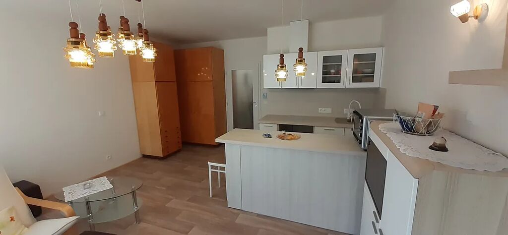 Obytná místnost s kuchyňskou částí vybavenou moderní designovou kuch.linkou se spotřebiči (myčka, lednice, trouba, varná deska) navazuje na odpočinkový prostor pro postavení postele či rozkládacího gauče. Rohová část pokoje je zařízena skříněmi na zavěšení oděvů i úložnou částí se šuplíky. Určitě rádi využijete i skryté zrcadlo.