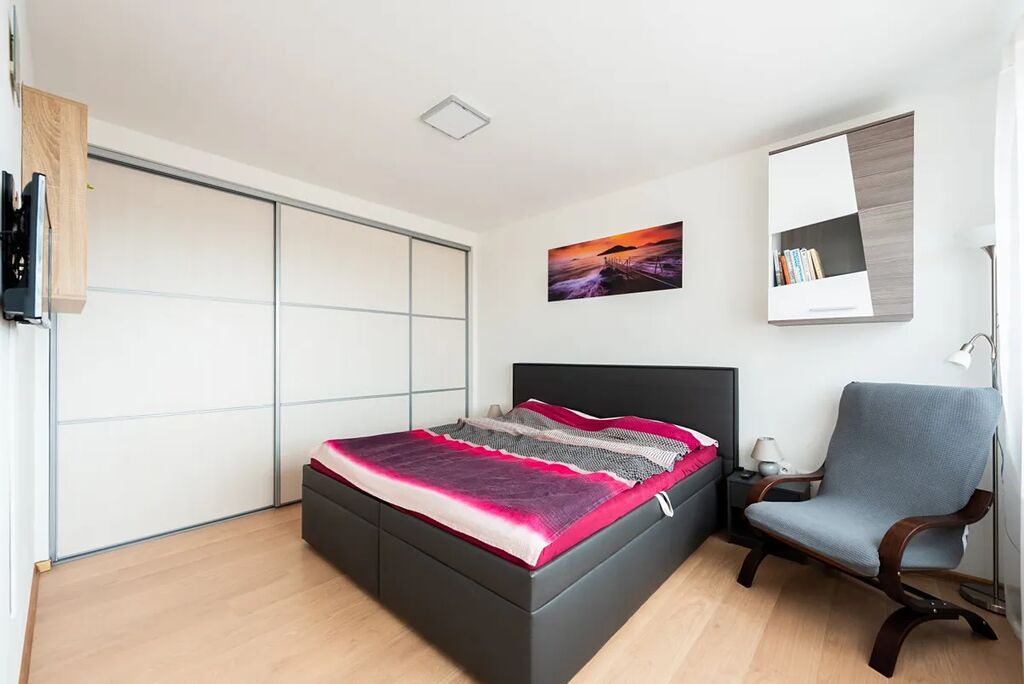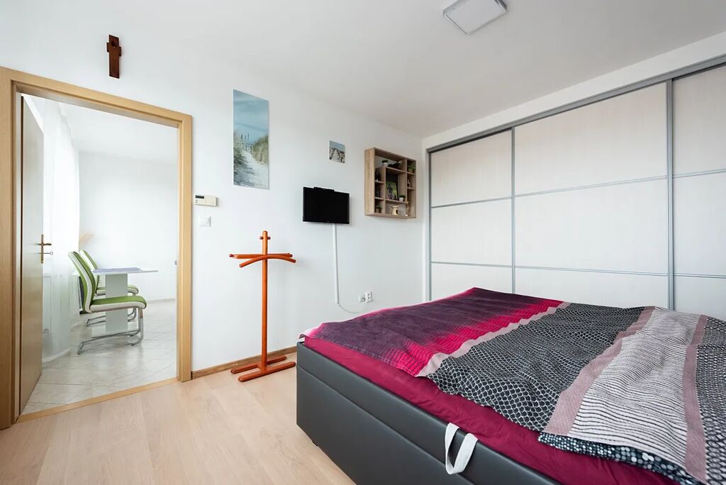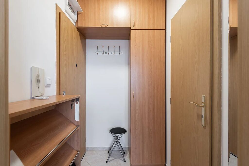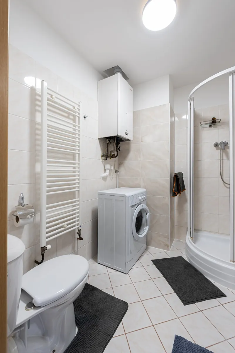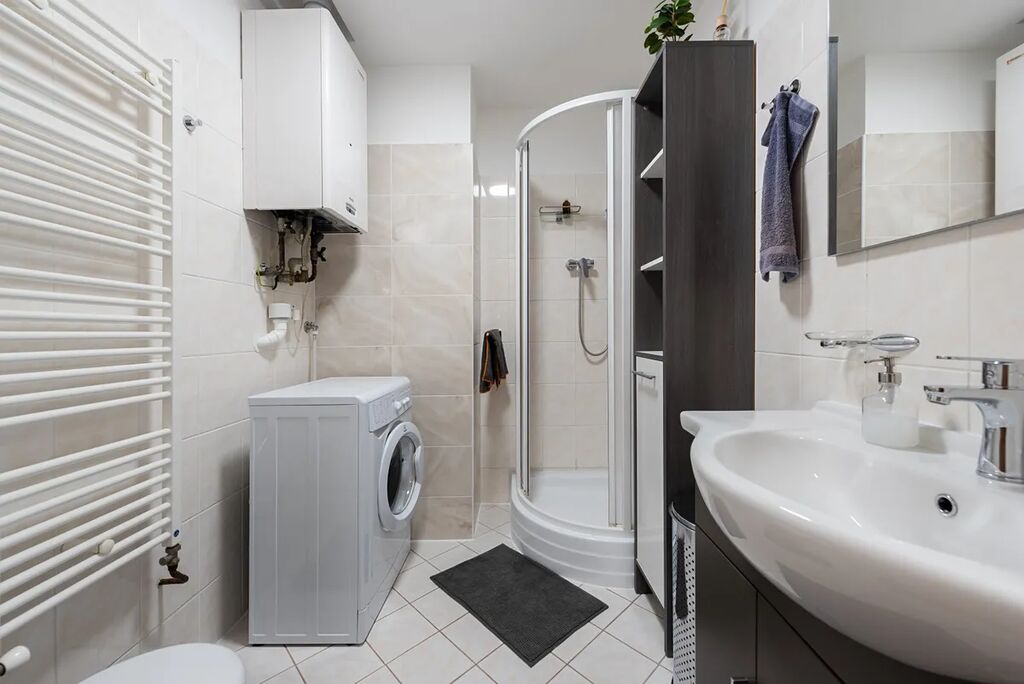Jedná se o prakticky řešený byt, kde se počítá s každým detailem a nabízí plnohodnotnou dispozici a vše, co je potřeba k životu. Na chodbě se nachází praktické úložné prostory a v ložnici je k dispozici velká vestavěná skříň. Koupelna je dostatečně prostorná a vešlo se do ní vše, co moderní domácnost vyžaduje – velké umyvadlo, prostorný sprchový kout, toaleta, pračka, topný žebřík i plynový kotel zajišťující vytápění a ohřev vody. Nechybí ani koupelnový nábytek pro další úložné místo.