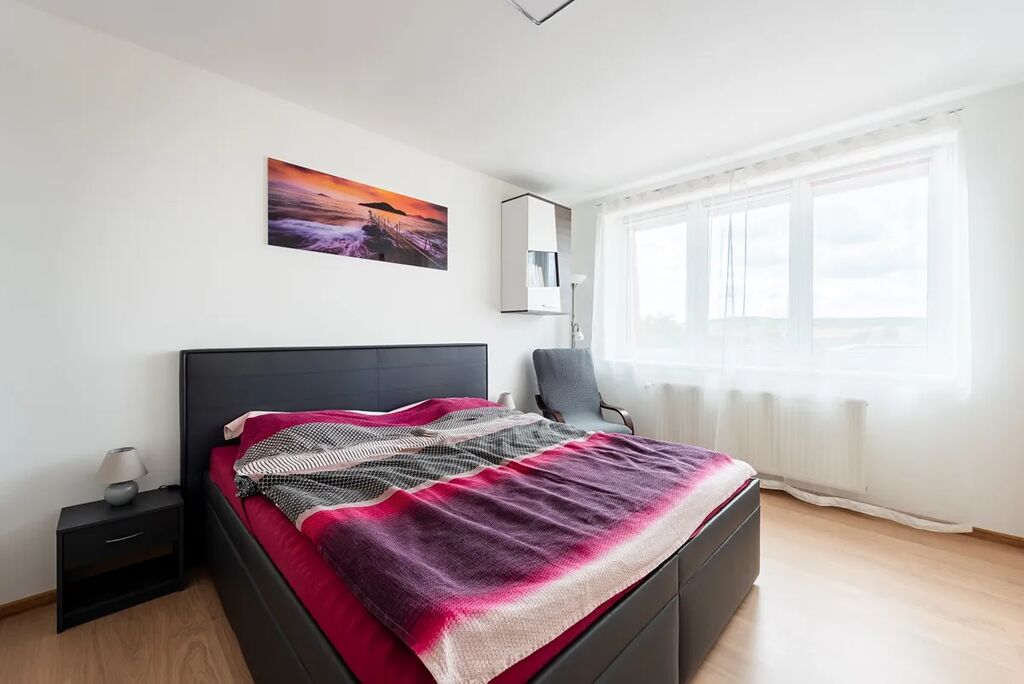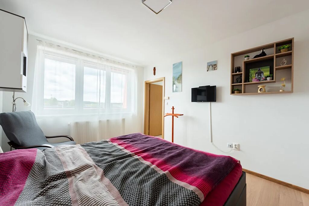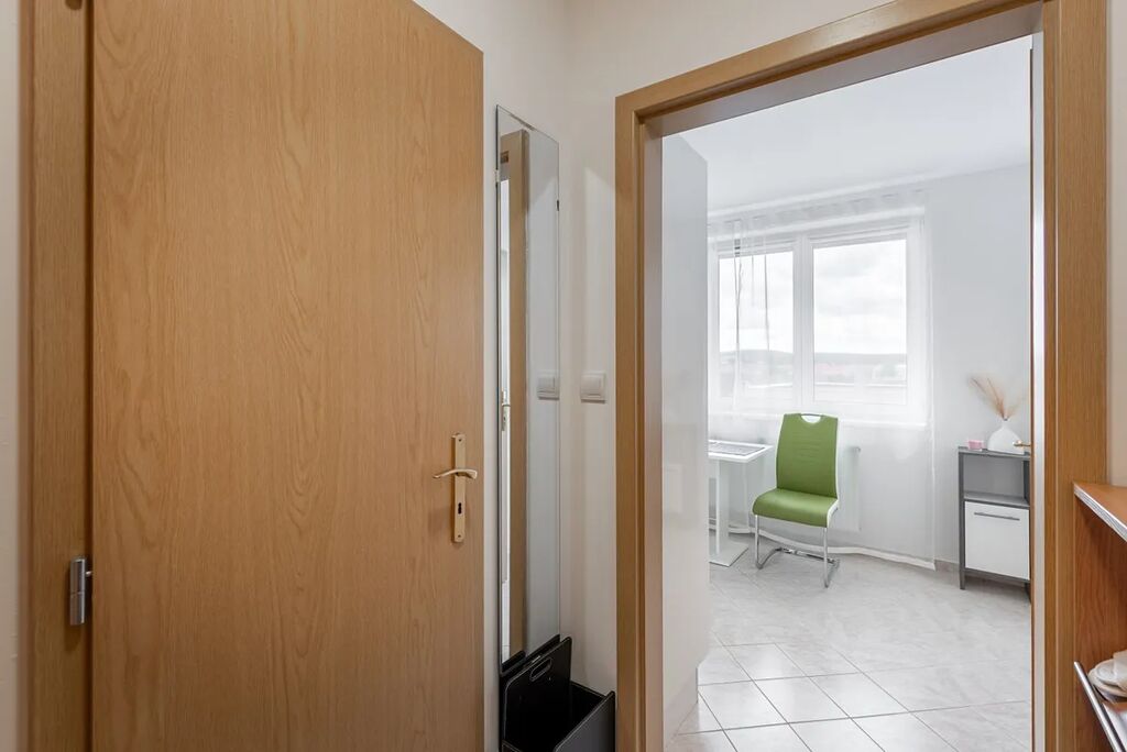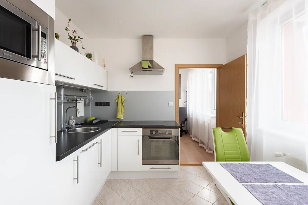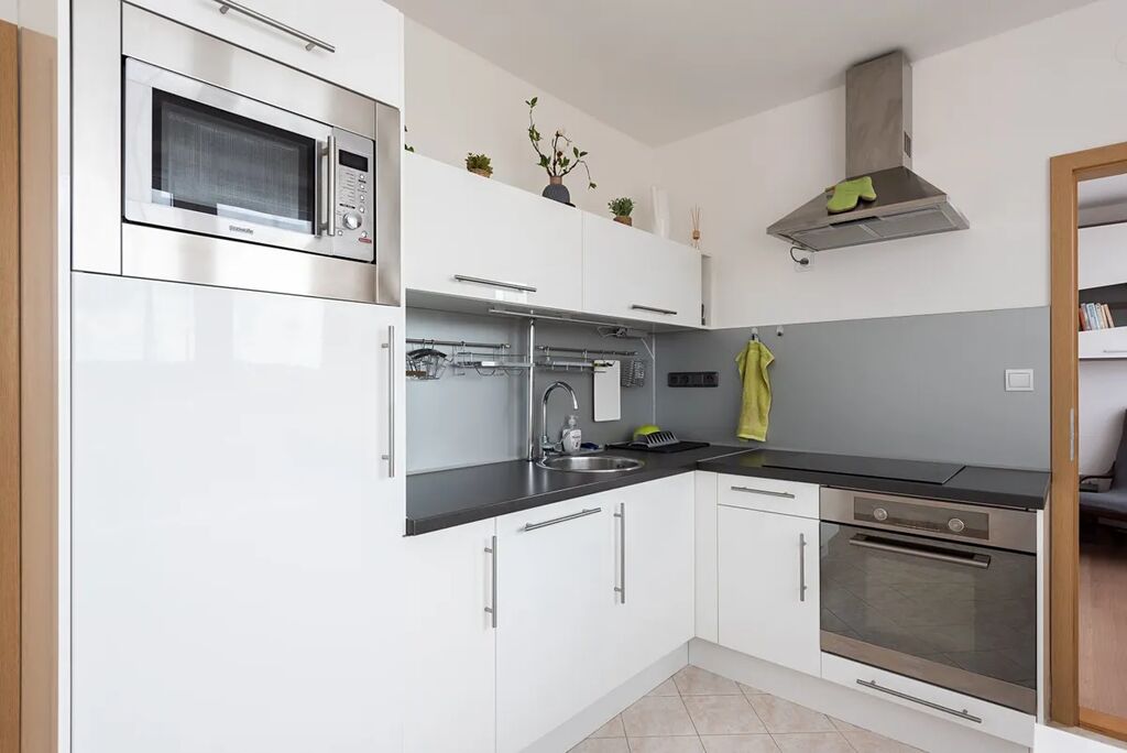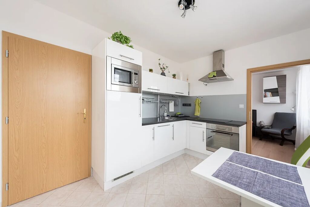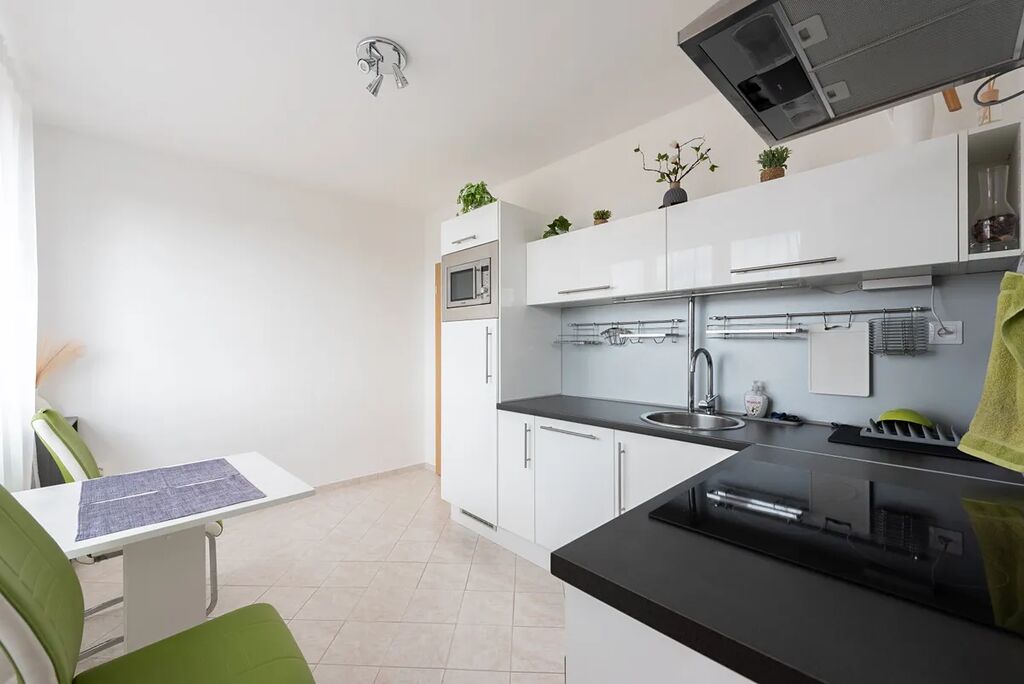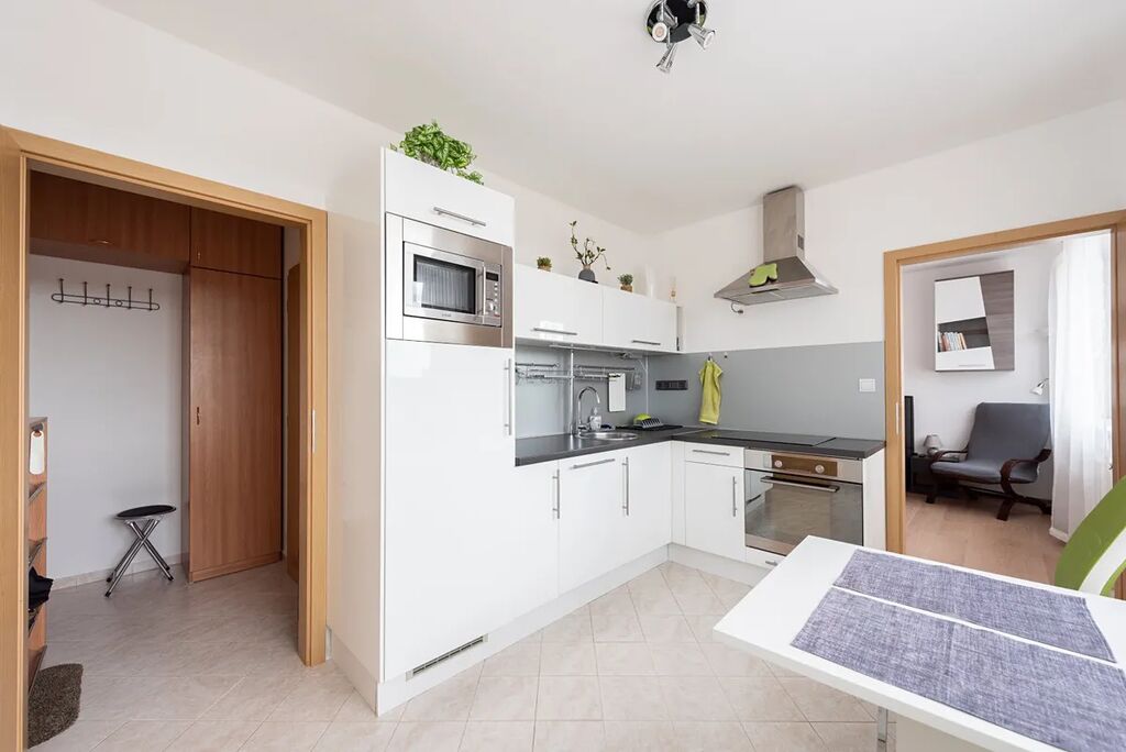 Kuchyňská linka je moderní, nadčasová a provedená v bílé barvě. Nabízí dostatek pracovní plochy i úložného prostoru a je plně vybavena vestavěnými spotřebiči – troubou, myčkou, lednicí, mikrovlnnou troubou, digestoří a varnou deskou. Přesto zůstalo místo i pro jídelní stůl, který dodává prostoru útulnost. Díky velkým oknům orientovaným na západ je byt krásně prosvětlený a působí velmi příjemně a vzdušně.