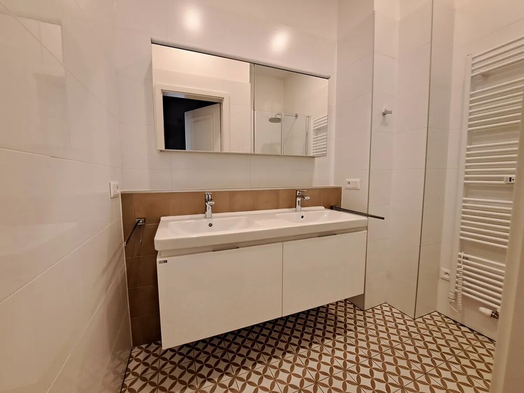 Koupelna (sprchový kout, 2x umyvadlo, zrcadlová skříňka, topný žebřík, věšáky na ručníky).