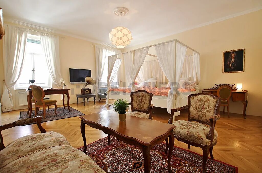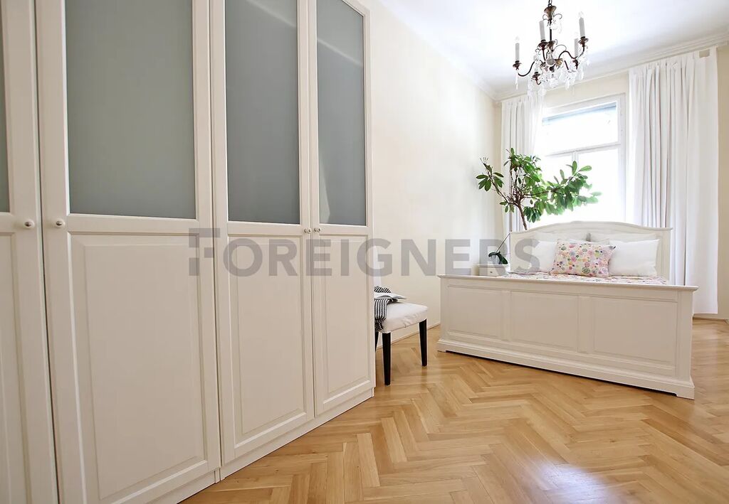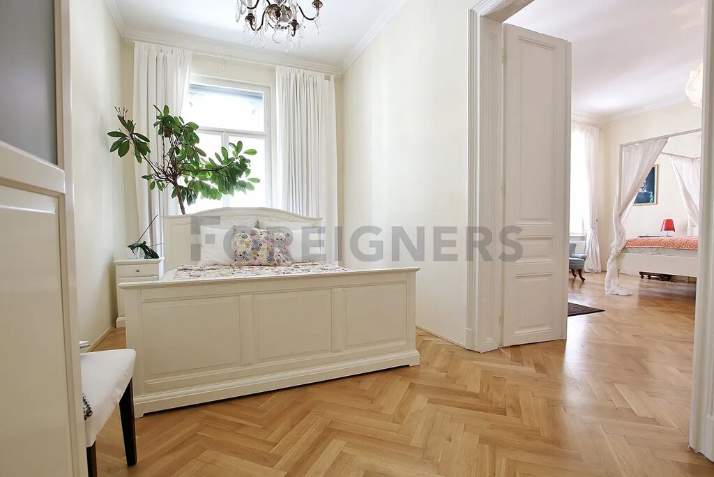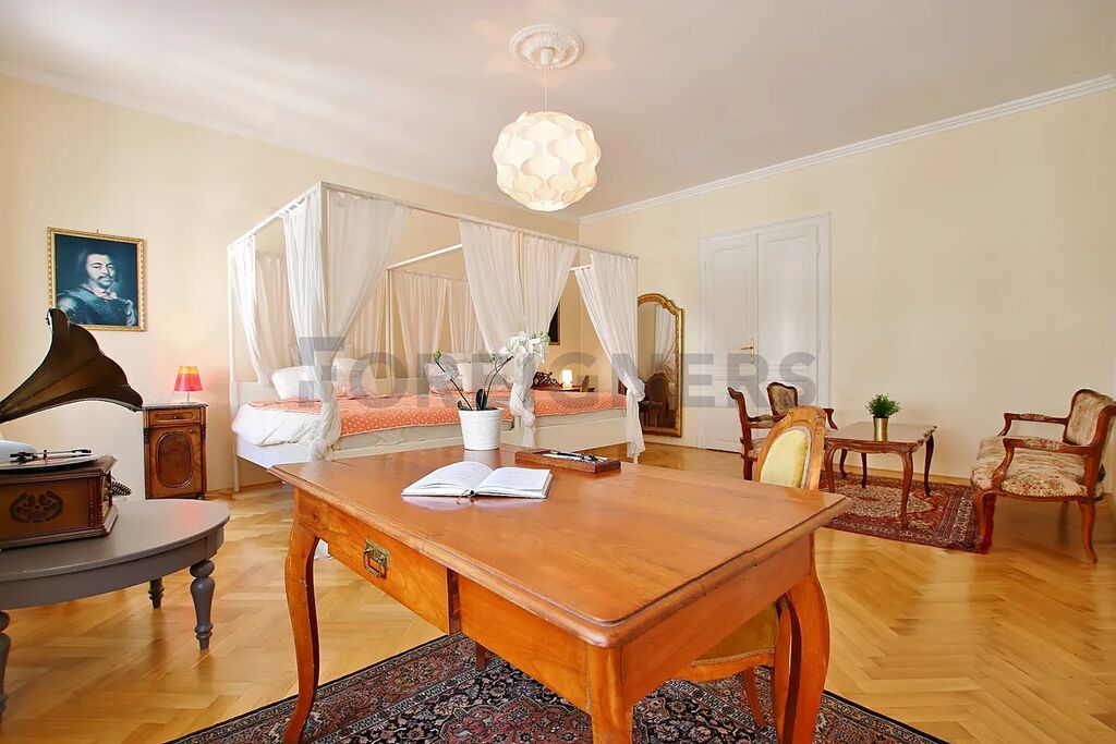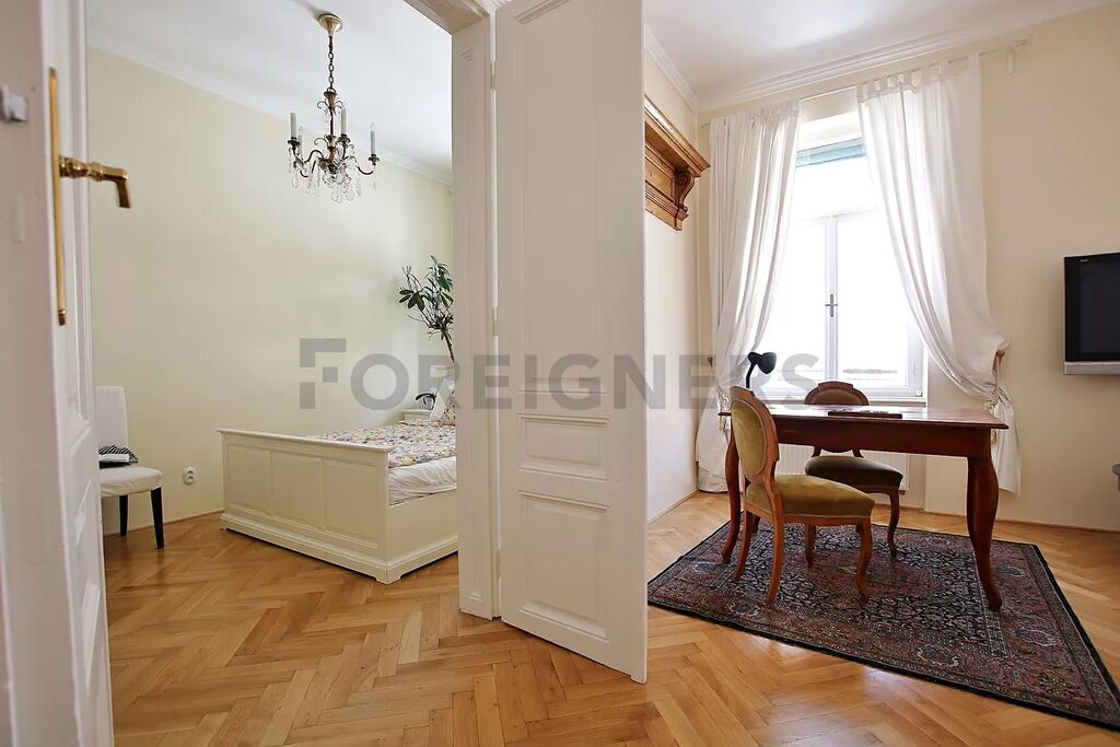 Byt je kompletně zařízený a připravený k nastěhování, nachází se ve 4. patře s výtahem. Vysoké stropy, velká okna a dřevěné parkety dodávají interiéru vzdušnost a eleganci. Byt má dva pokoje, z toho jeden je průchozí. Hlavní ložnice s renovovaným antik nábytkem a moderními prvky (psací stůl, židle, koberce, manželská postel, TV)