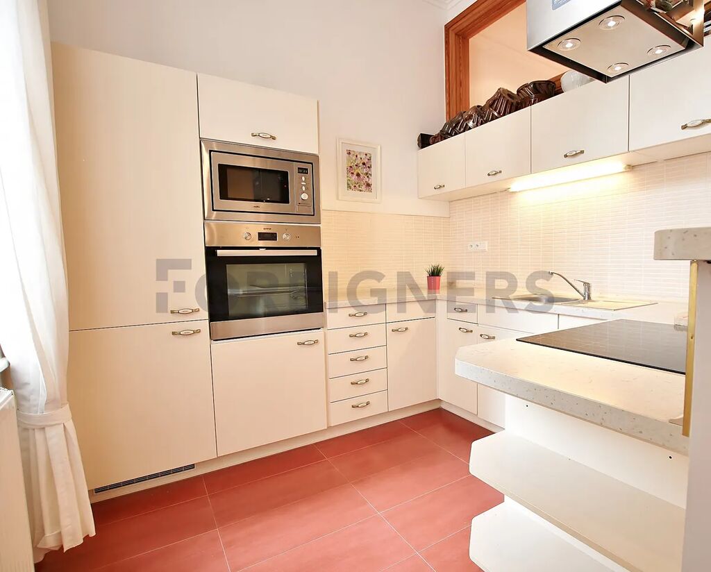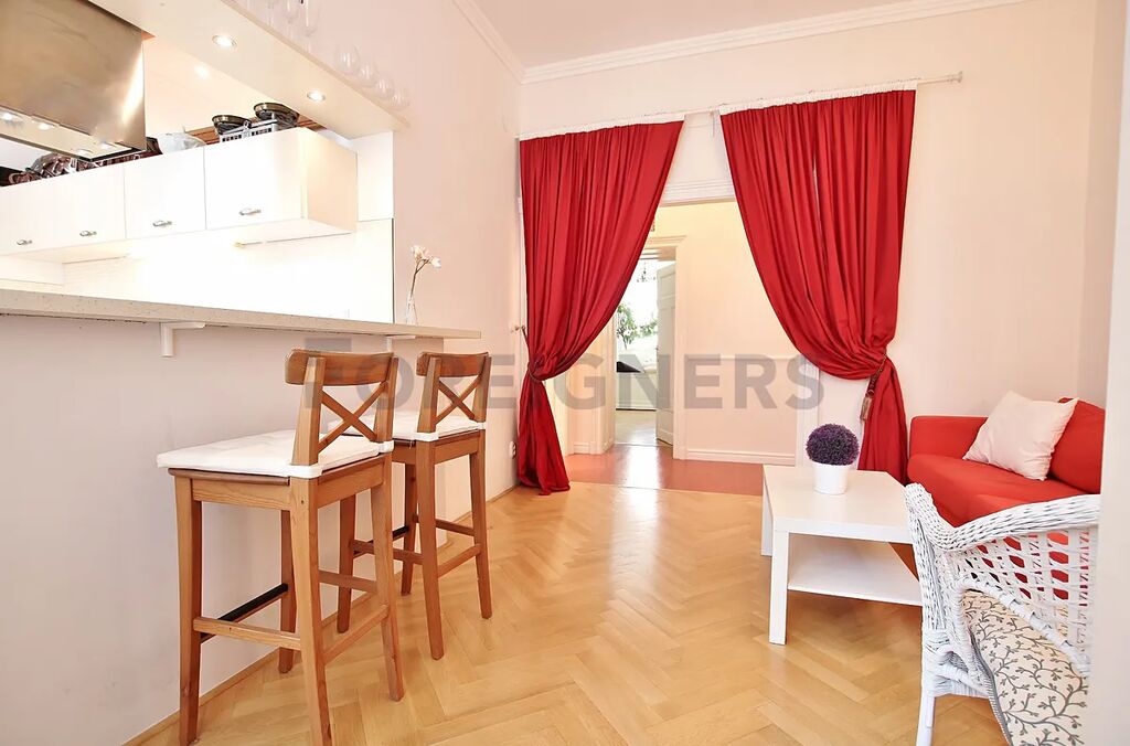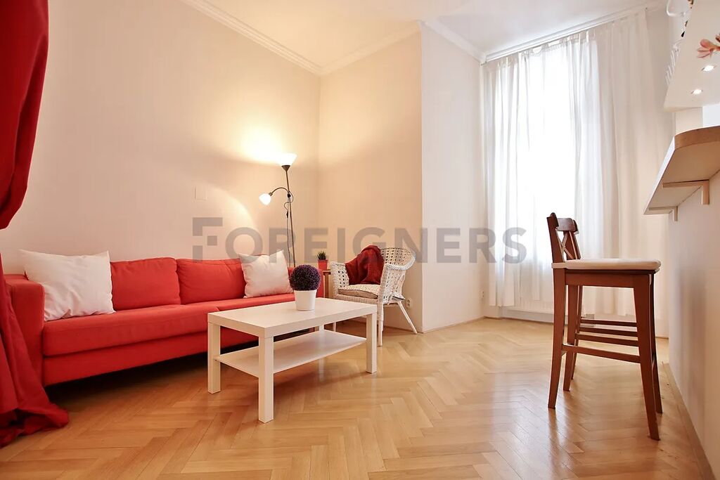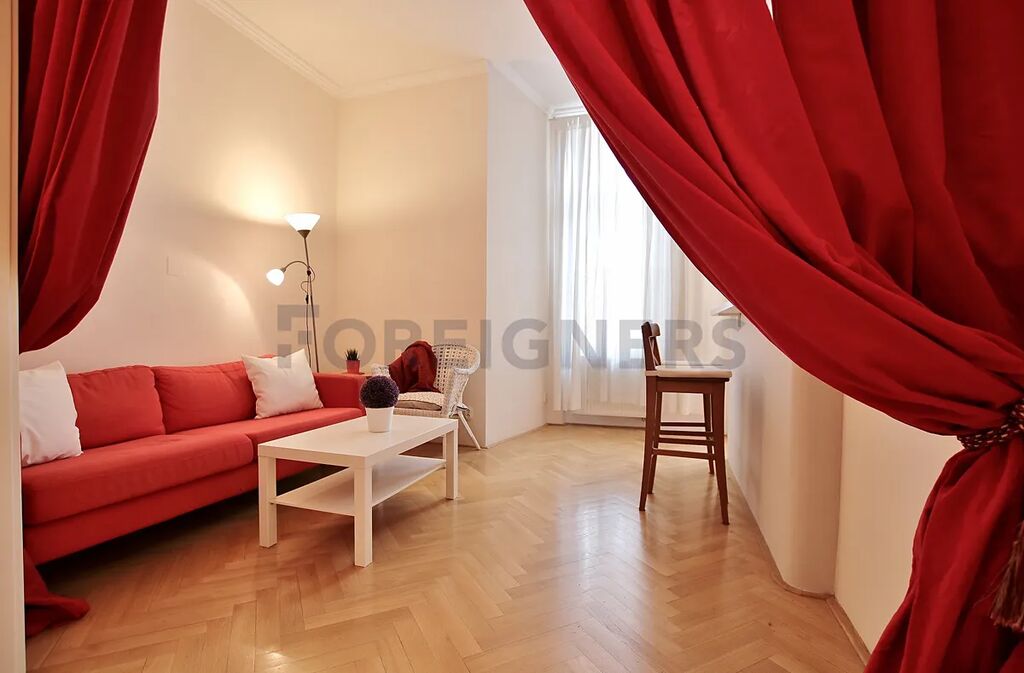 Byt je kompletně zařízený a připravený k nastěhování, nachází se ve 4. patře s výtahem. Vysoké stropy, velká okna a dřevěné parkety dodávají interiéru vzdušnost a eleganci. Byt má dva pokoje, z toho jeden je průchozí. Hlavní ložnice s renovovaným antik nábytkem a moderními prvky (psací stůl, židle, koberce, manželská postel, TV)