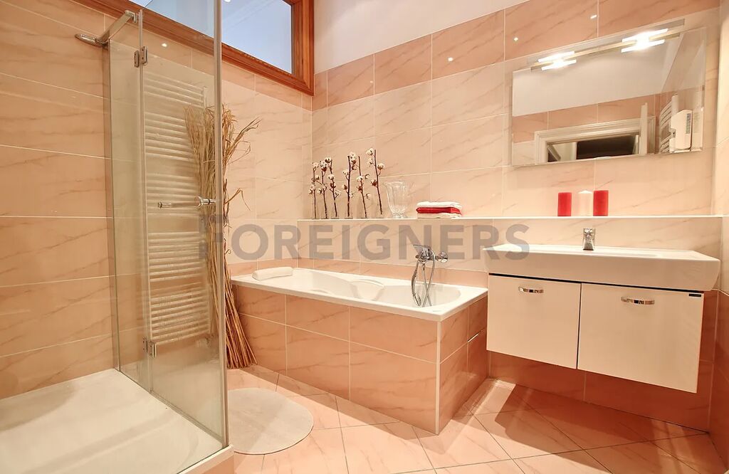 Stylová koupelna s vanou i sprchovým koutem, samostatné WC