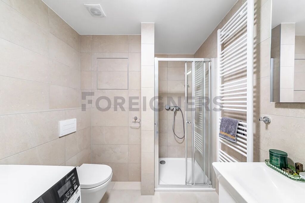 Koupelna s moderním sprchovým koutem, včetně umyvadlové skříňky, s podsvíceným zrcadlem, toaletou a pračkou.