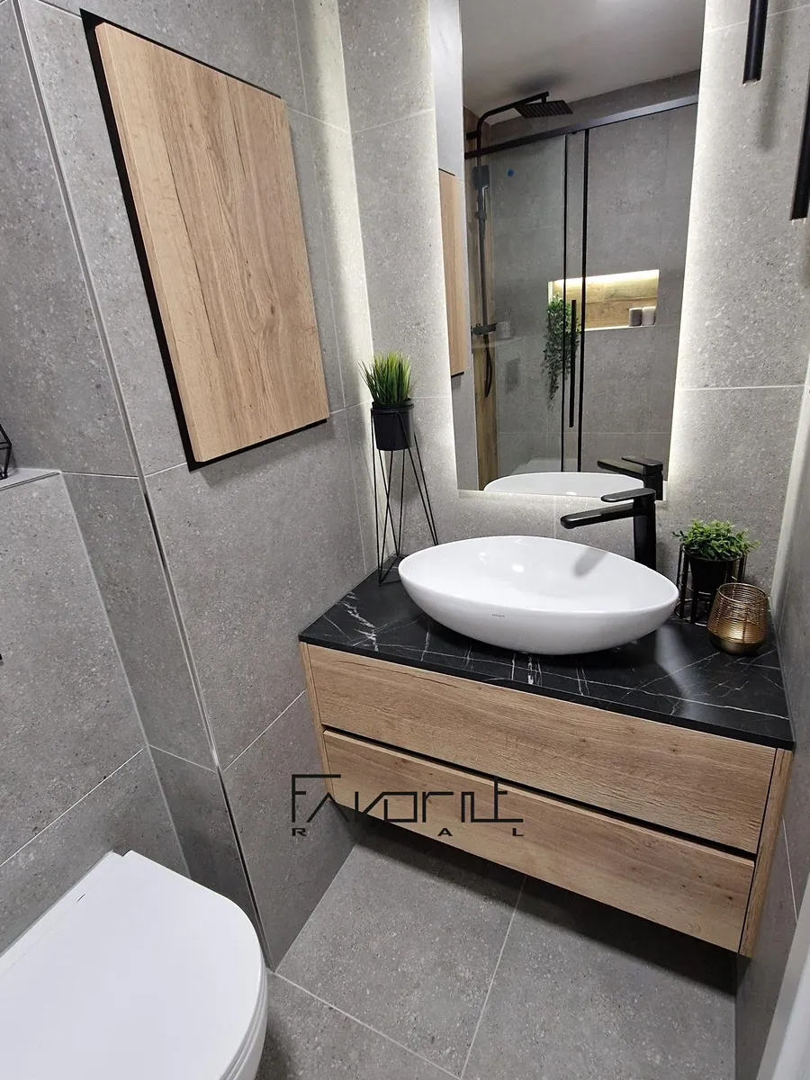 V koupelně nové obklady, dlažba, umyvadlo se skříňkou, baterie, zrcadlo, sprchový kout.