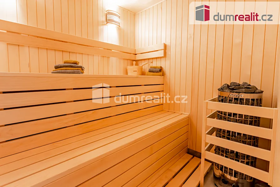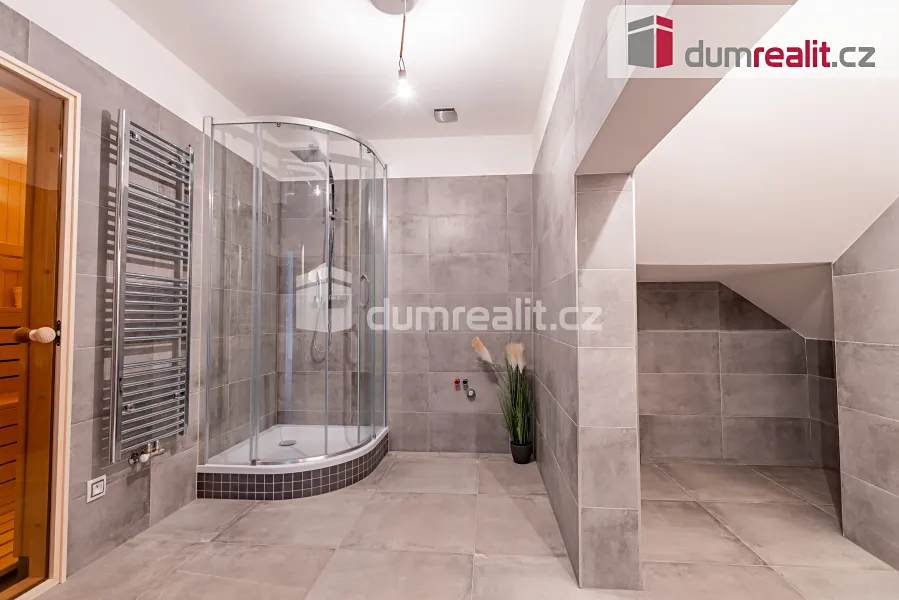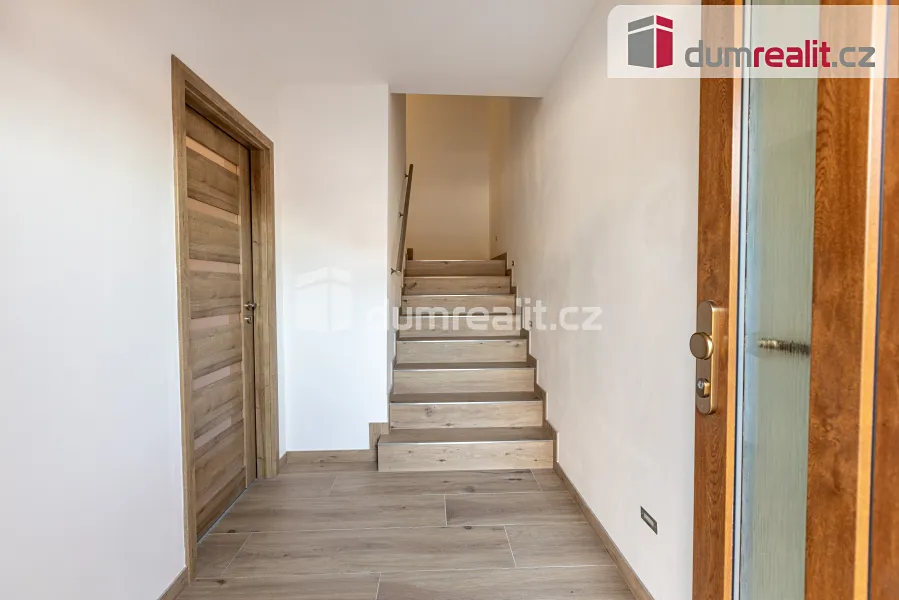 Přízemí se skládá ze vstupní chodby, z které je přístup do garáže, technické místnosti s šatnou na zimní věci a boty, dále z garáže do místnosti pro posilovnu, sauny s wc a sprchovým koutem. Je zde i úložný prostor pod schody, které vedou do 1. patra do vzdušného a velmi prosvětleného obývacího pokoje, s jídelní částí a kuchyňským koutem, wc, koupelnou se sprchovým koutem, ložnicí a malou šatnou.