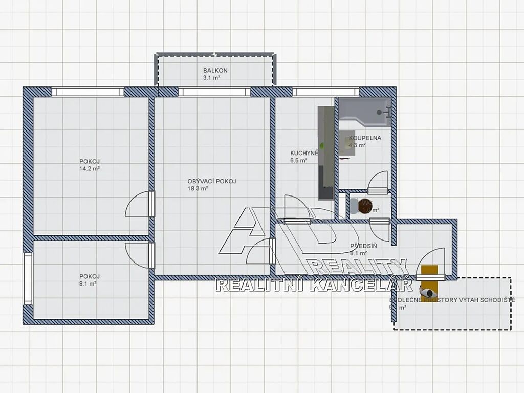 Dispozice bytu: obývací pokoj [18,4m2], samostatná ložnice [14,3m2], pokoj [8,1m2], kuchyně [6,5m2], předsíň [8,5m2], koupelna WC [5,4m2]. K bytu je k dispozici sklepní kóje v 1.NP (technické podlaží – přízemí) domu o výměře cca [2,2m2]. Topení v bytě centrální / ústřední dálkové (radiátory), podružné měření spotřeby teplé a studené vody (vodoměry), samostatné měření spotřeby elektřiny (elektroměr). V bytě je možnost připojení internetu (Starnet) a STA.