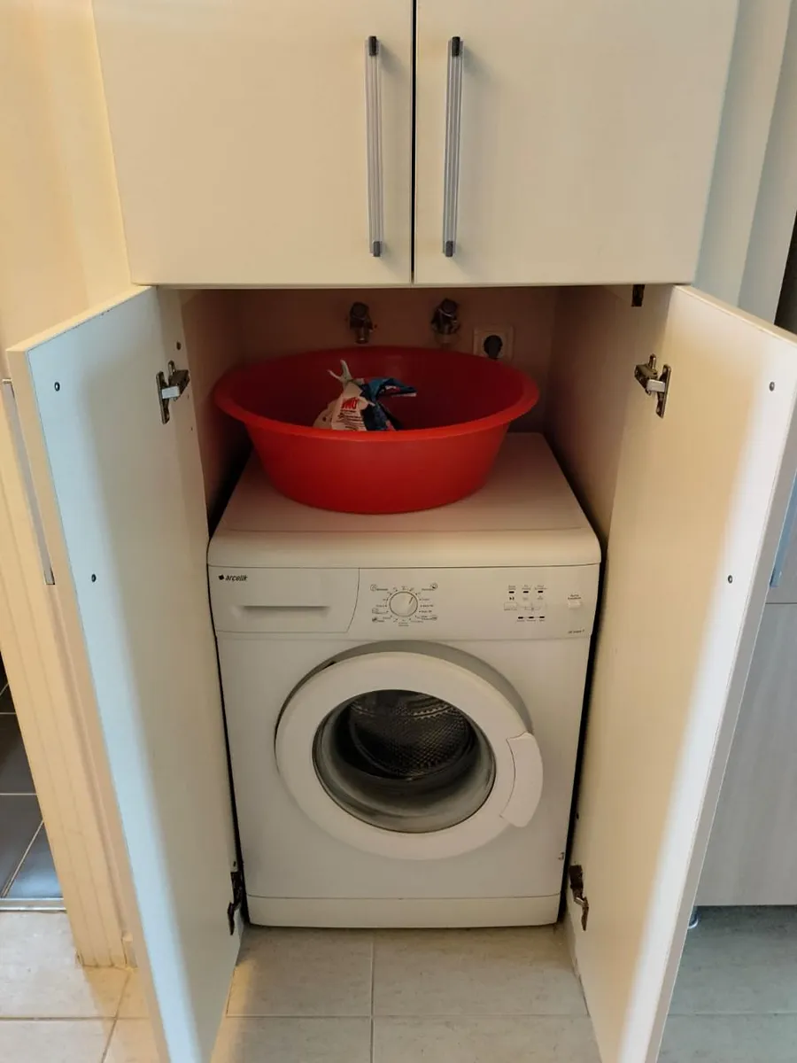 Moderní kuchyňská linka s varnou deskou, troubou, digestoří, myčkou a pračkou