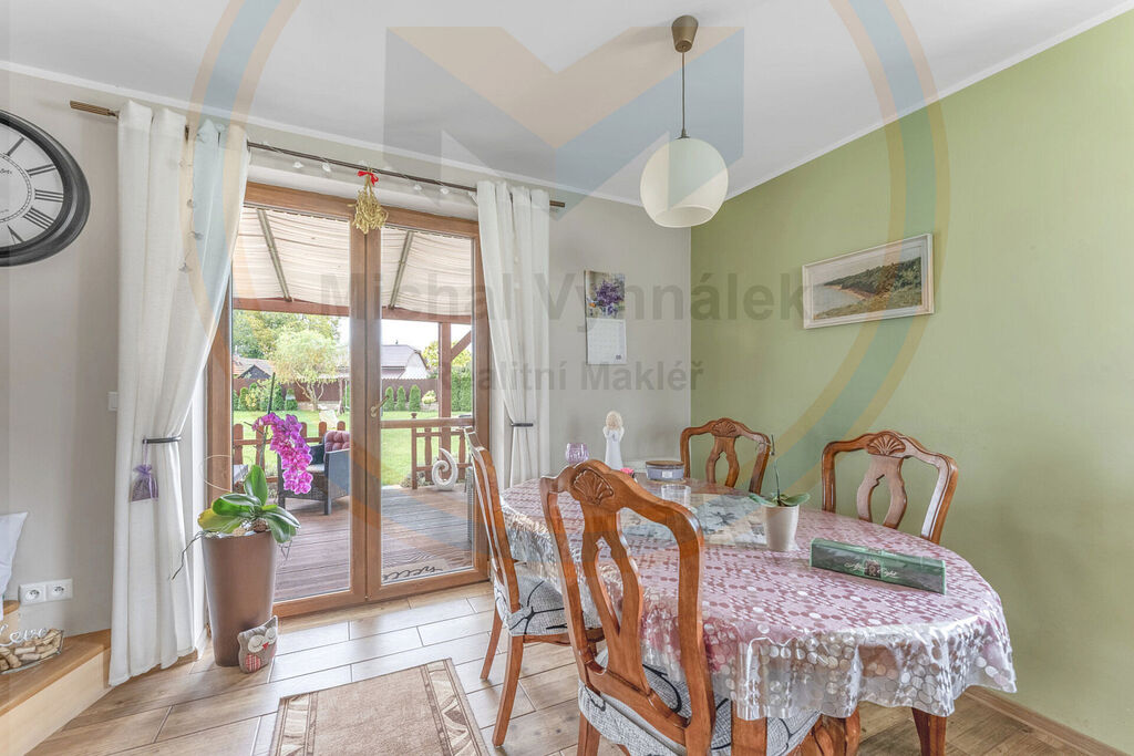 V přízemí (1. NP) dominuje plně vybavený kuchyňský kout navazující na otevřený jídelní prostor. Z něj můžete vyjít na krytou terasu a vychutnat si kávu s výhledem do zahrady.