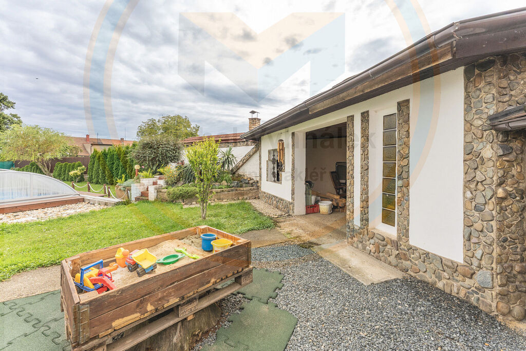 Prostorný samostatně stojící rodinný dům 5+kk, dvě koupelny, bazén, 2x garáž + další místo na parkování na příjezdové cestě a zahrada s posezením – ideální místo pro váš nový domov jen 40 minut od Prahy.
