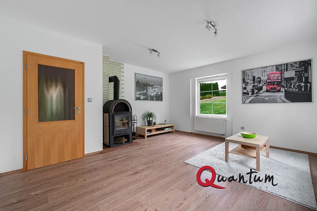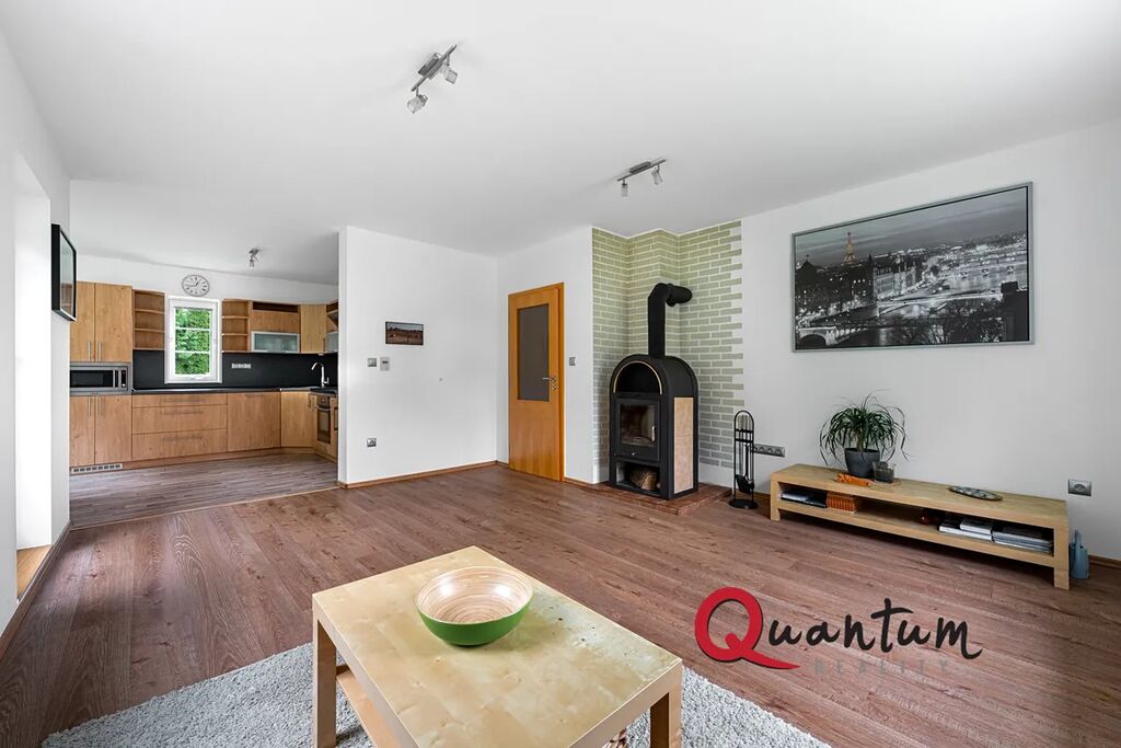 Prostorná kuchyň s obývacím pokojem a krbovými kamny s vchodem na venkovní terasu.