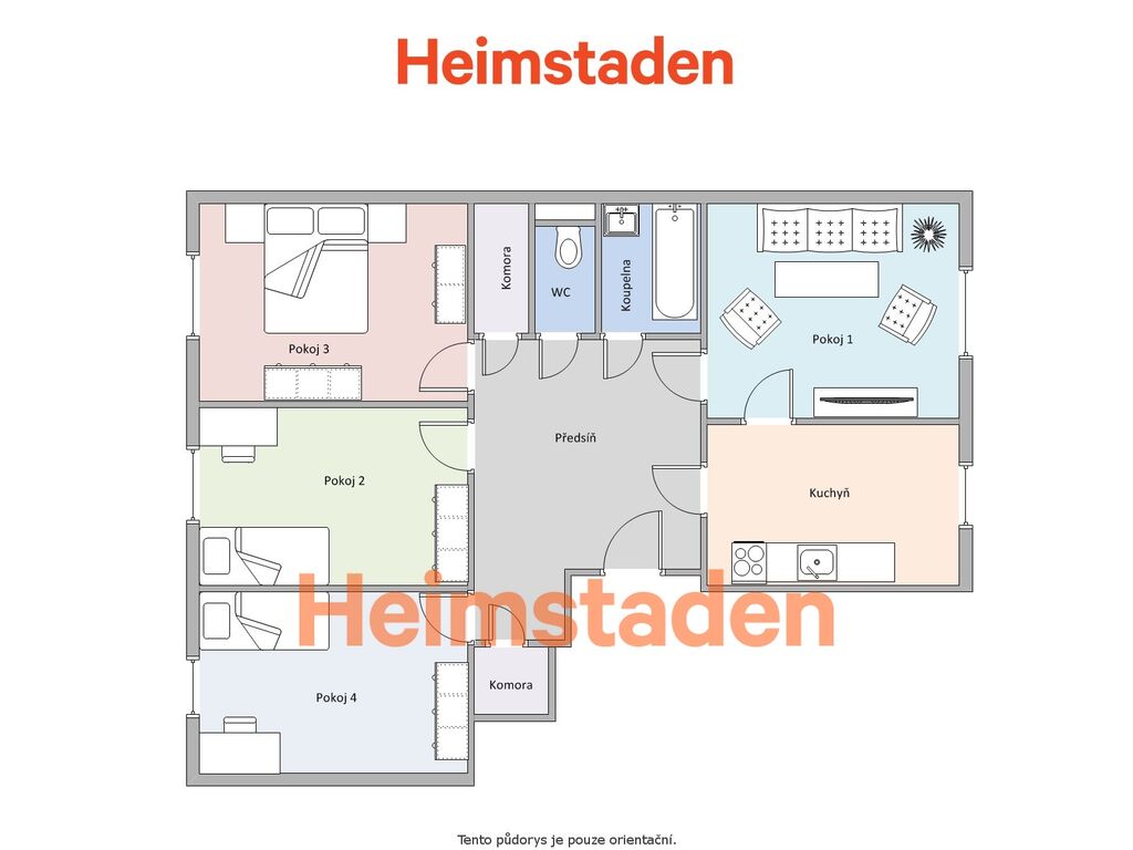 Byt o celkové ploše 91 m² se nachází ve 4. patře domu. Dispozice nabízí komfortní obývací pokoj, tři samostatné ložnice a koupelnu. K bytu náleží také praktická komora.