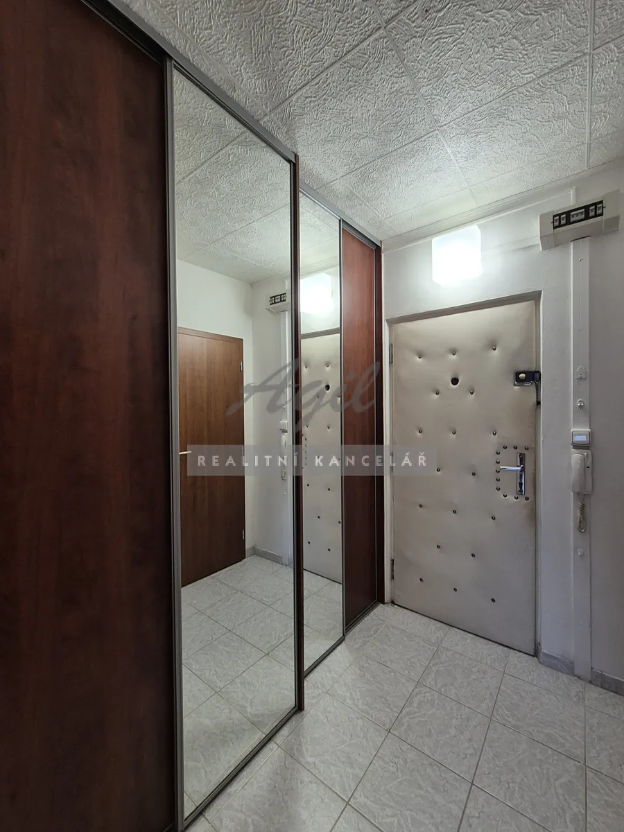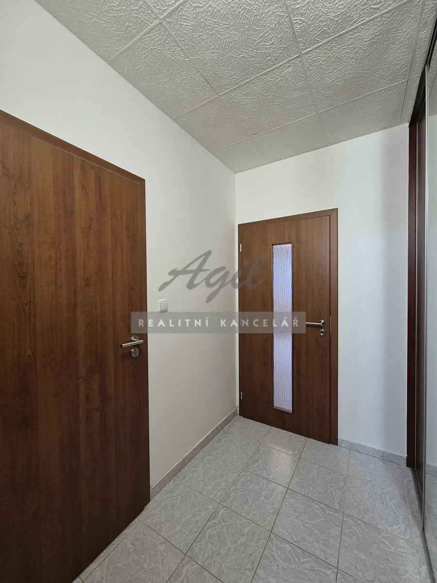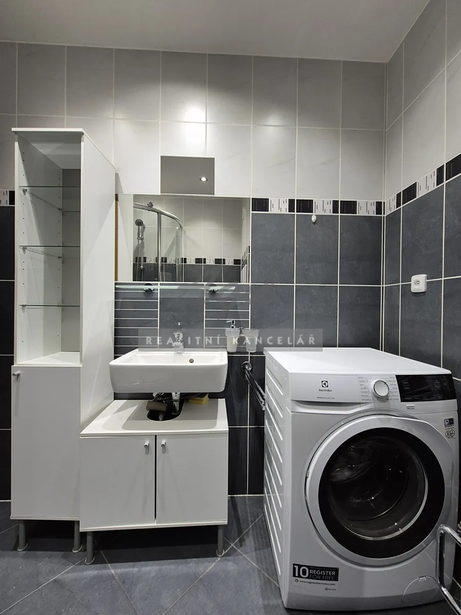 Předsíň – na míru dělaná vestavěná skříň. Koupelna – sprchový kout, závěsné WC, umyvadlo se skříňkou, elektrický žebřík, polička, přípojka na pračku, pračka. Kuchyně s kk – kuchyňská linka, elektrická vestavěná trouba, indukční deska, mikrovlnná trouba, lednice s mrazákem, jídelní stůl 2x židle, volně stojící policová skříňka, komoda se třemi šuplíky, křeslo, 2x bílá nástěnná police