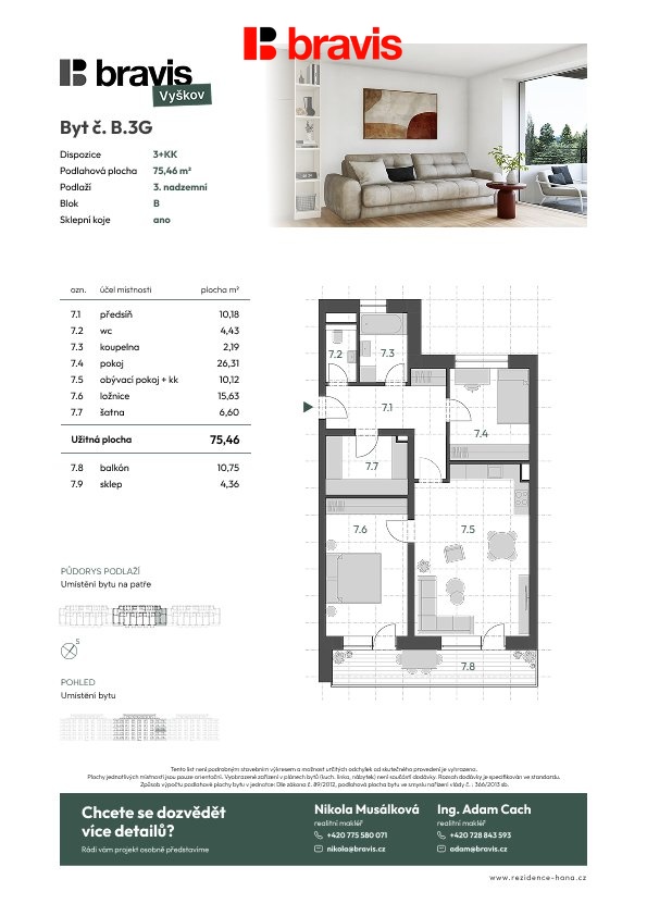 Nabízíme byt B.2G – 3+kk, 75,46 m², umístěný ve 2. nadzemním podlaží. Díky praktické dispozici a balkonu o velikosti 10,75 m² je ideální pro rodinné bydlení i jako výhodná investice. Součástí ceny je také sklepní kóje (4,36 m²).