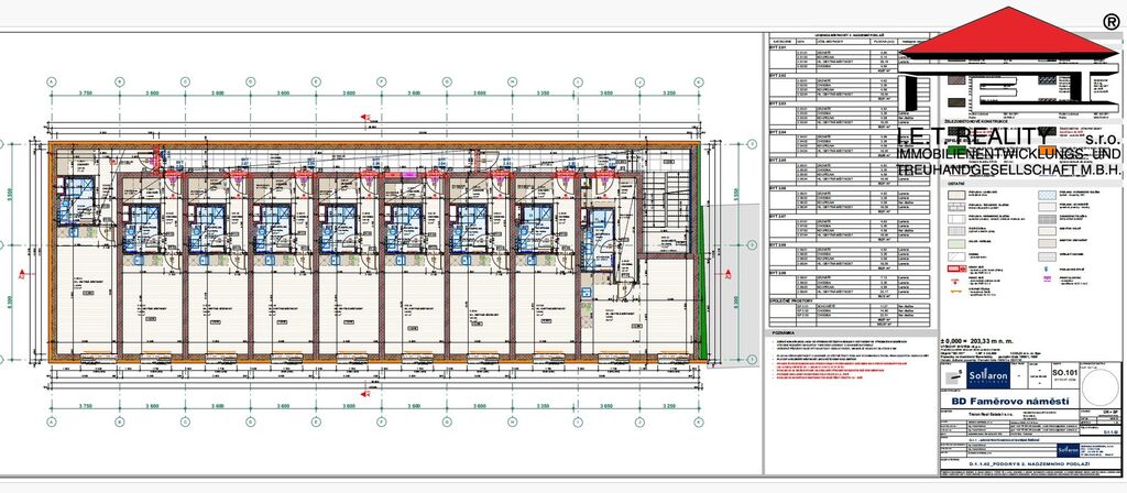 Samotný dům je navržen jako moderní betonová stavba s kvalitní fasádou a extenzivní zelenou střechou. Společné prostory jsou provedeny ve vysokém standardu – keramická dlažba, sádrové omítky, osvětlení na pohybová čidla, kolárna, technická místnost a samostatně řešená místnost pro odpad přímo v domě. V rámci projektu jsou k dispozici také garážová stání s dálkovým ovládáním.