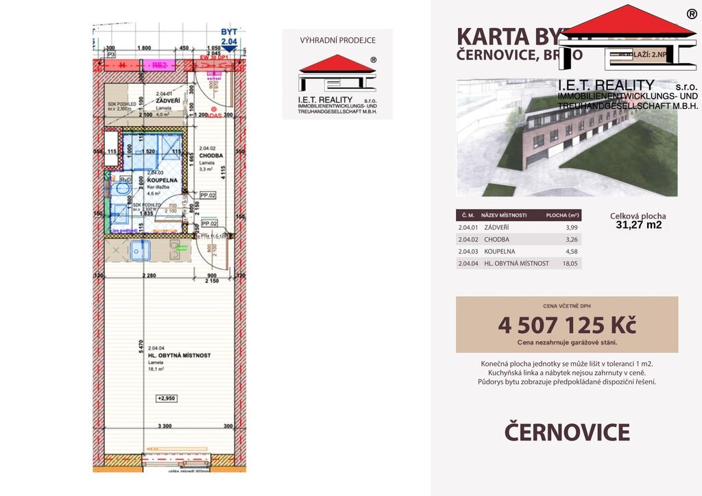 Nabízíme k prodeji nový byt s označením 2.04 o dispozici 1+kk v právě vznikajícím projektu Bytový dům Faměrovo náměstí v Brně. Byt o celkové výměře 31,27 m² se nachází v moderní novostavbě s důrazem na kvalitní provedení, funkční dispozice a moderní městské bydlení. K bytu dále náleží jedno parkovací místo v 1.NP tohoto bytového domu za cenu 583.245,- Kč, které není zahrnuto v kupní ceně.