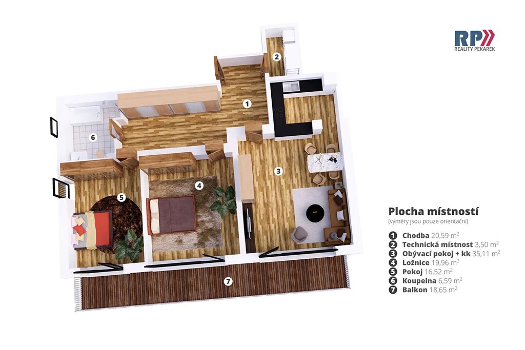 Dispozice bytu je znázorněna na půdorysu a vizualizaci v obrázkové části inzerce. Byt má výměru 102 m2 + balkon 19 m2. K bytu patří 2 parkovací stání a venkovní skladová kóje.
