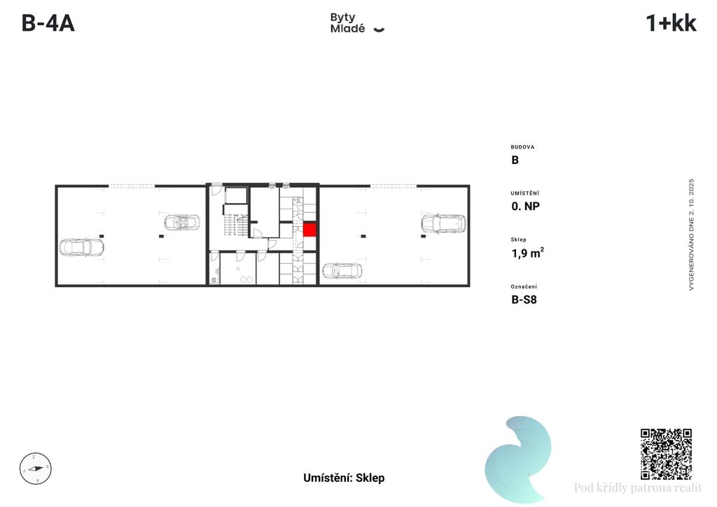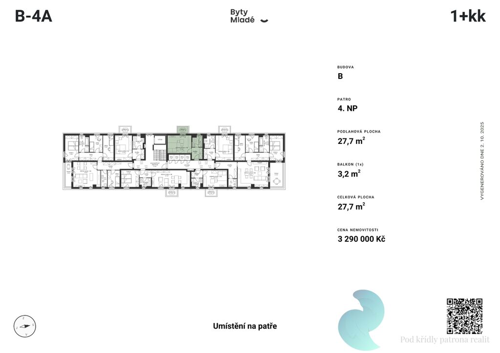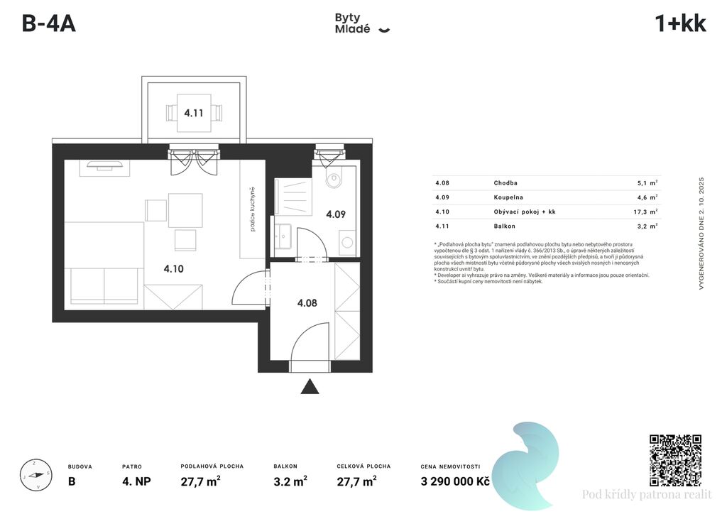 Nabízený byt č. B-4A o dispozici 1+kk, výměře 27,7 m2 a balkonem 3,2 m2, se nachází v prvním patře budovy B. Disponuje vstupní chodbou, koupelnou a obývacím pokojem s kuchyňským koutem.