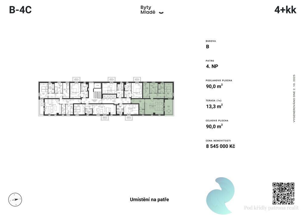 Nabízený byt č. B-4C o dispozici 4+kk, výměře 90 m2 a lodžií 13,3 m2, se nachází ve třetím patře budovy B. Disponuje vstupní chodbou, koupelnou, obývacím pokojem s kuchyňským koutem, neprůchozím pokojem, samostatnou toaletou a ložnicí.