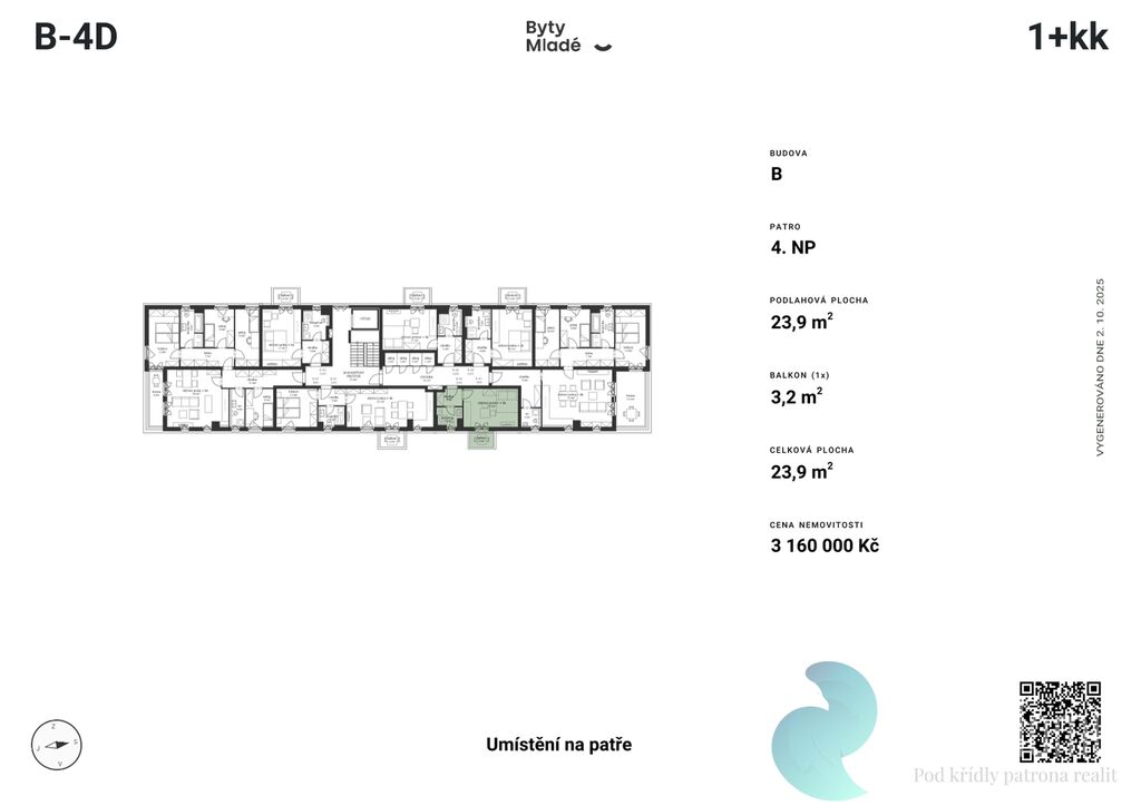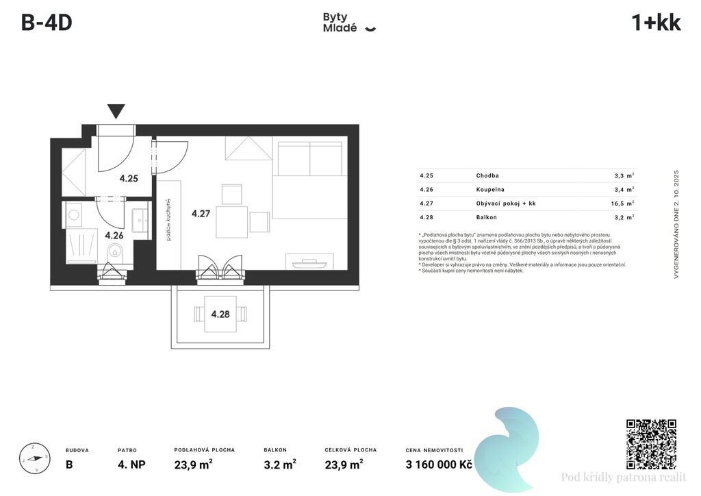 Nabízený byt č. B-4D o dispozici 1+kk, výměře 23,9 m2 a balkonem 3,2 m2, se nachází ve třetím patře budovy B. Disponuje vstupní chodbou, koupelnou a obývacím pokojem s kuchyňským koutem.