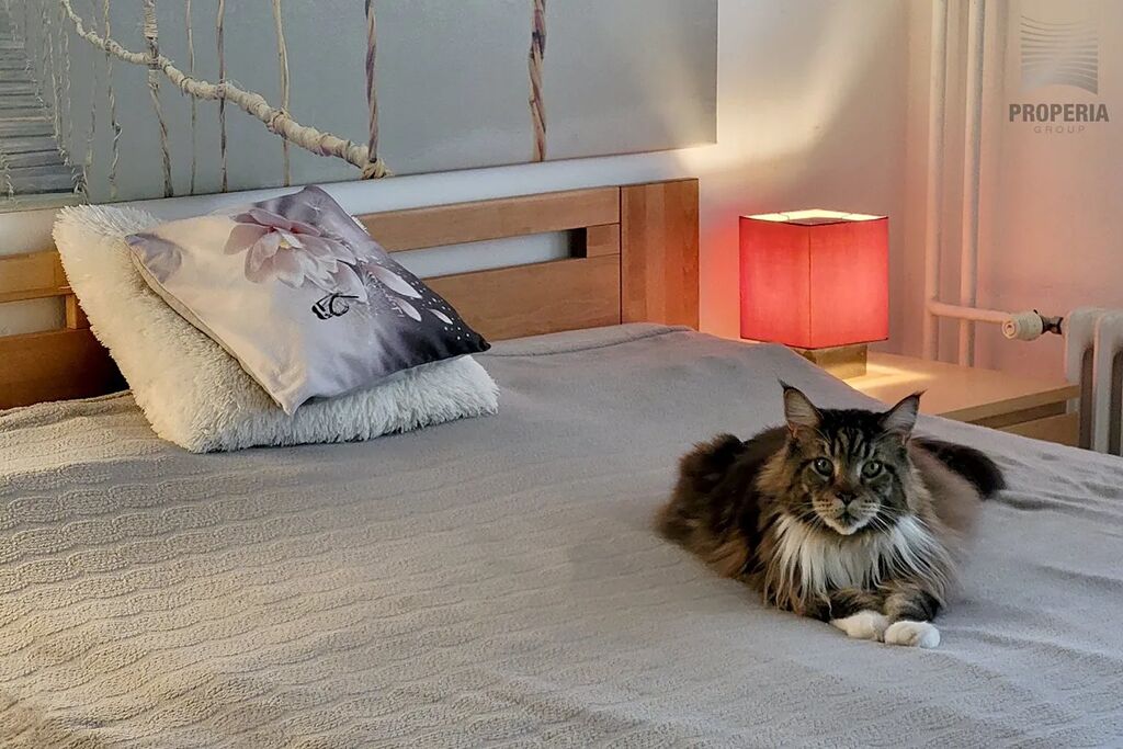 Byt 4+1 (4+kk) se nachází ve zvýšeném přízemí, jeho plocha je 90 m2 + balkon 5 m2. Disponuje velkou předsíní, kuchyní, sociálním zázemím a 4 prostornými pokoji (21, 16, 16 a 10 m2). Jak můžete vidět na přiloženém orientačním půdorysu, všechny místnosti mají samostatné vstupy z chodby, nejsou průchozí. Úložné prostory o výměře 15 m2 nabízí další samostatná místnost (sklep) v suterénu domu.