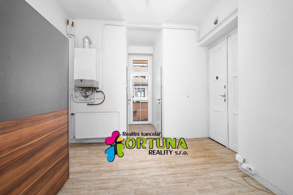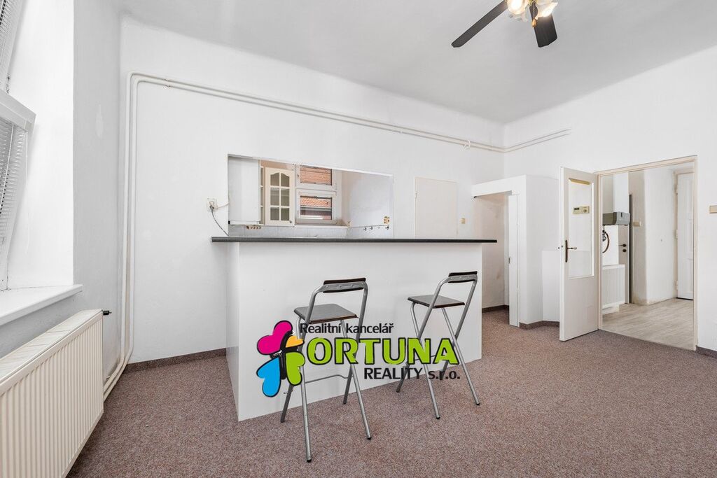 Byt je situovaný ve čtvrtém patře zděného domu bez výtahu. Ze vstupní chodby je vstup do WC, do šatny a dále pak do obývacího pokoje s kuchyňským koutem.