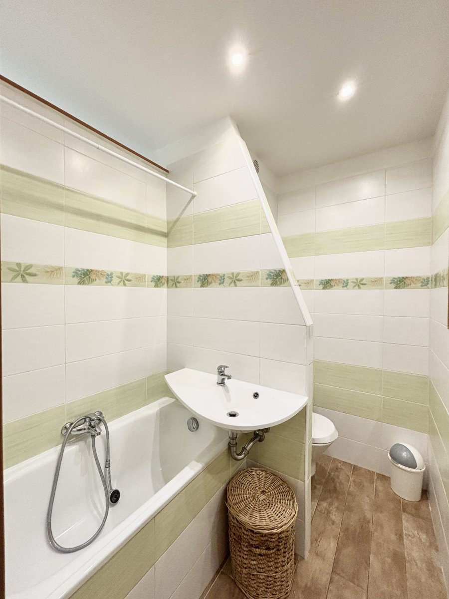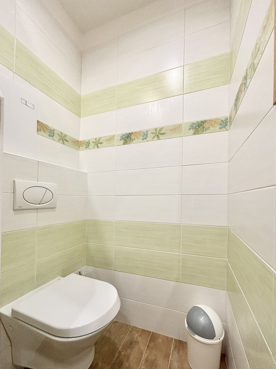 Byt se nabízí částečně vybavený. Kuchyně disponuje lednicí, mikrovlnnou troubou, varnou deskou a digestoří. Obývací část je zařízena pracovním stolem, jídelním pultem a křeslem. V koupelně je vana, umyvadlo a toaleta. V předsíni se nechází botník.