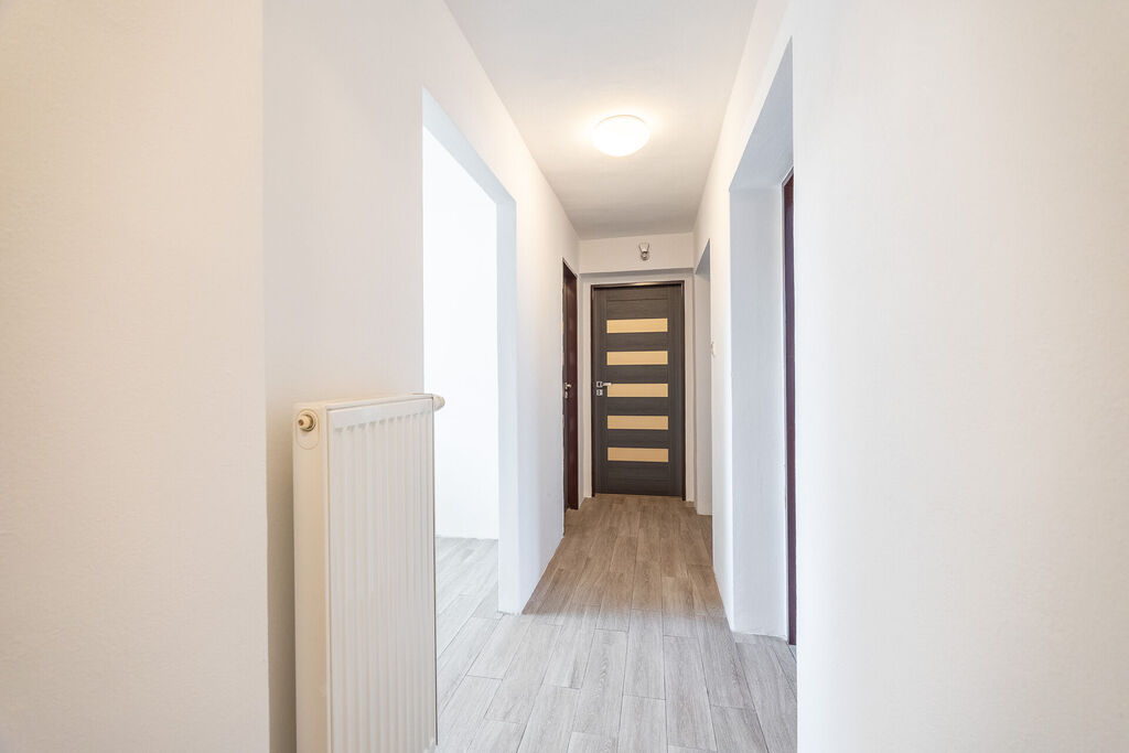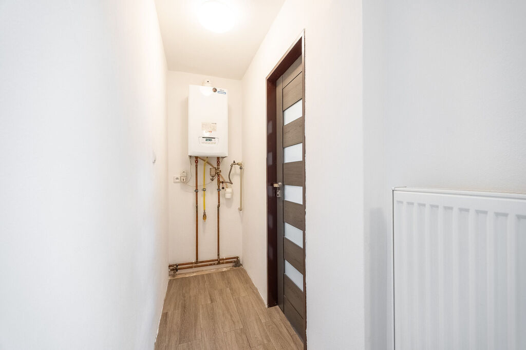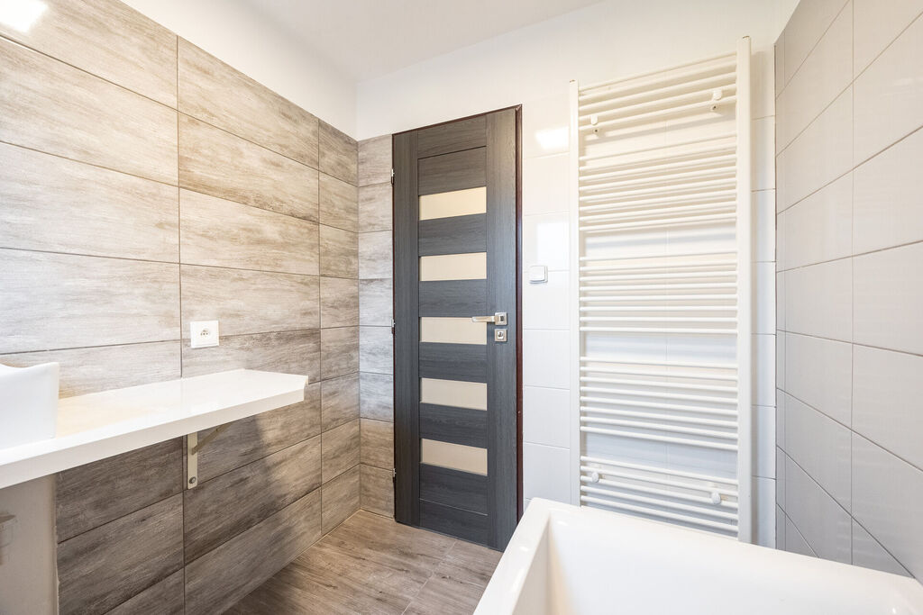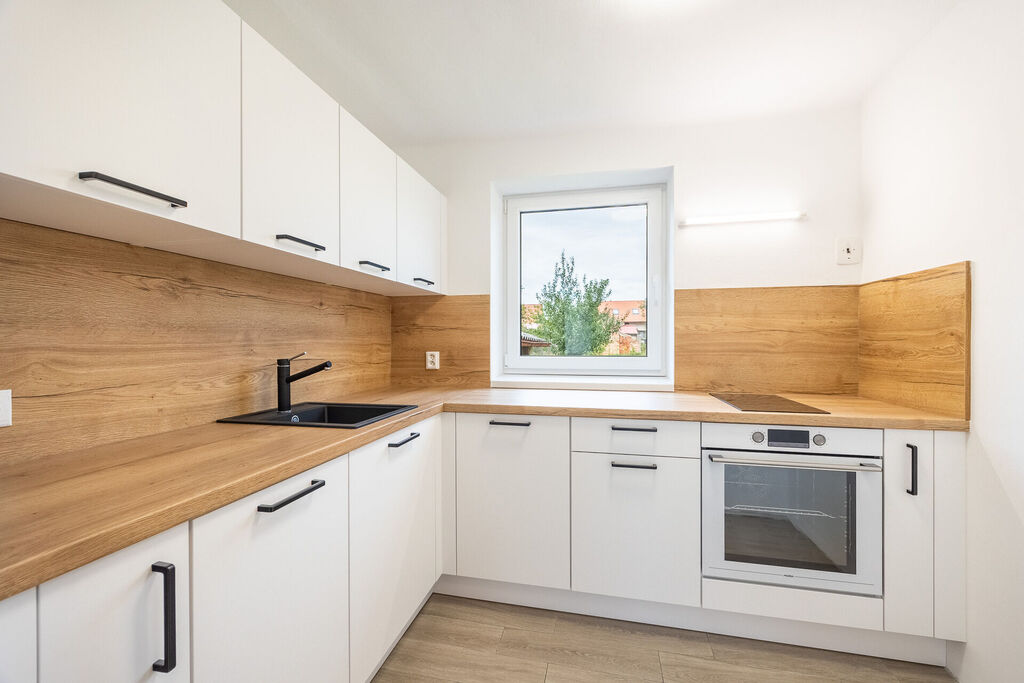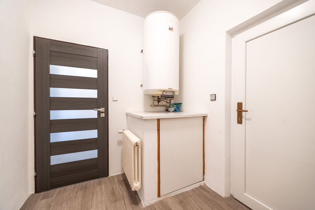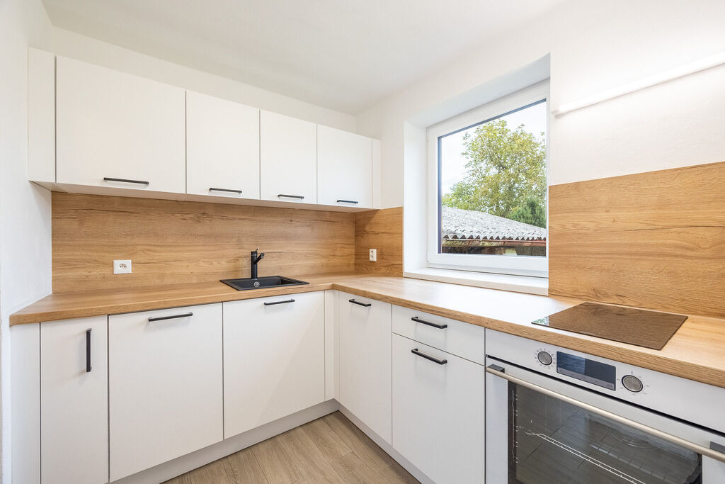 Koupelna s vanou je oázou klidu, kde si můžete dopřát zaslouženou koupel, a toaleta je umístěna samostatně pro vaše pohodlí. Kuchyň je srdcem domu, vybavená novou, moderní kuchyňskou linkou, která zahrnuje horkovzdušnou troubu, indukční sporák a myčku. Množství úložných prostor vám umožní mít vše na dosah ruky, zatímco výhled do zahrady vás potěší každé ráno.