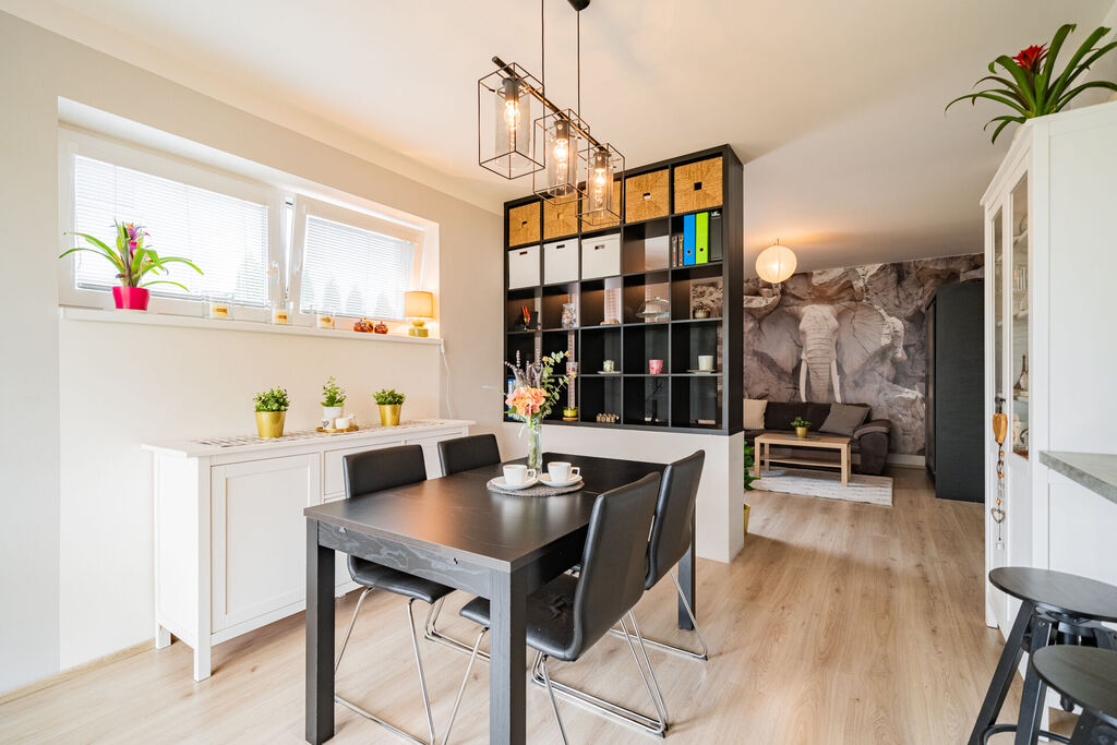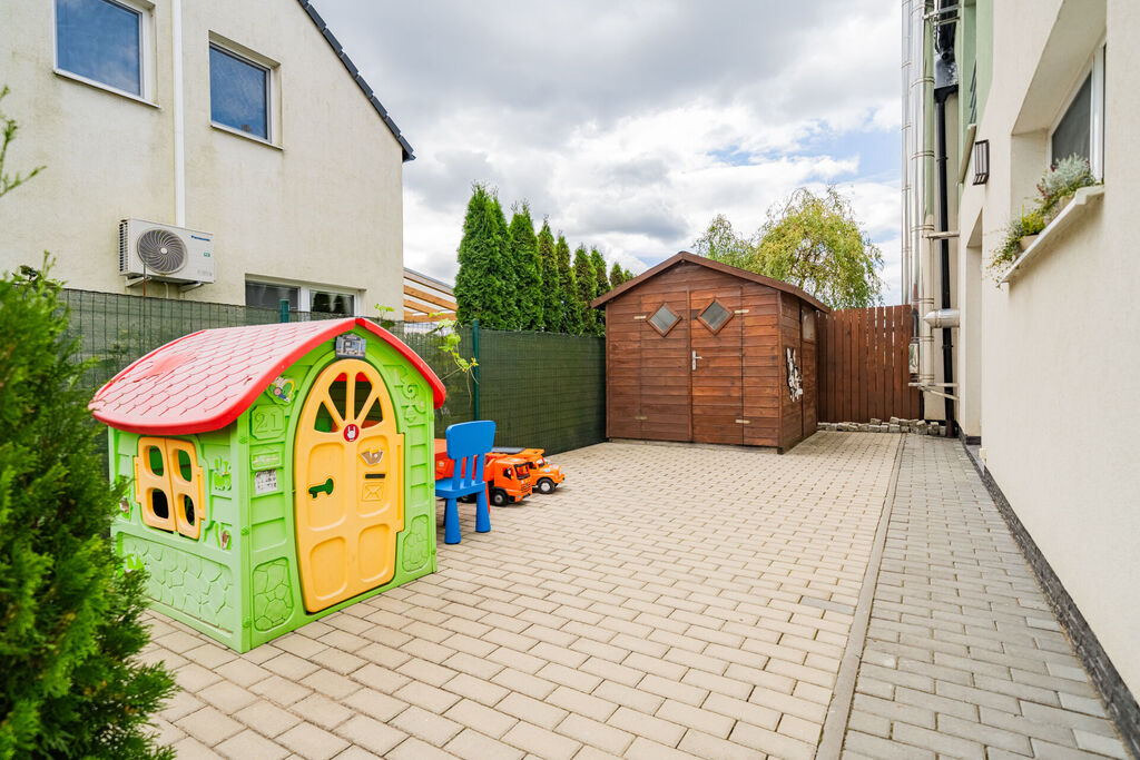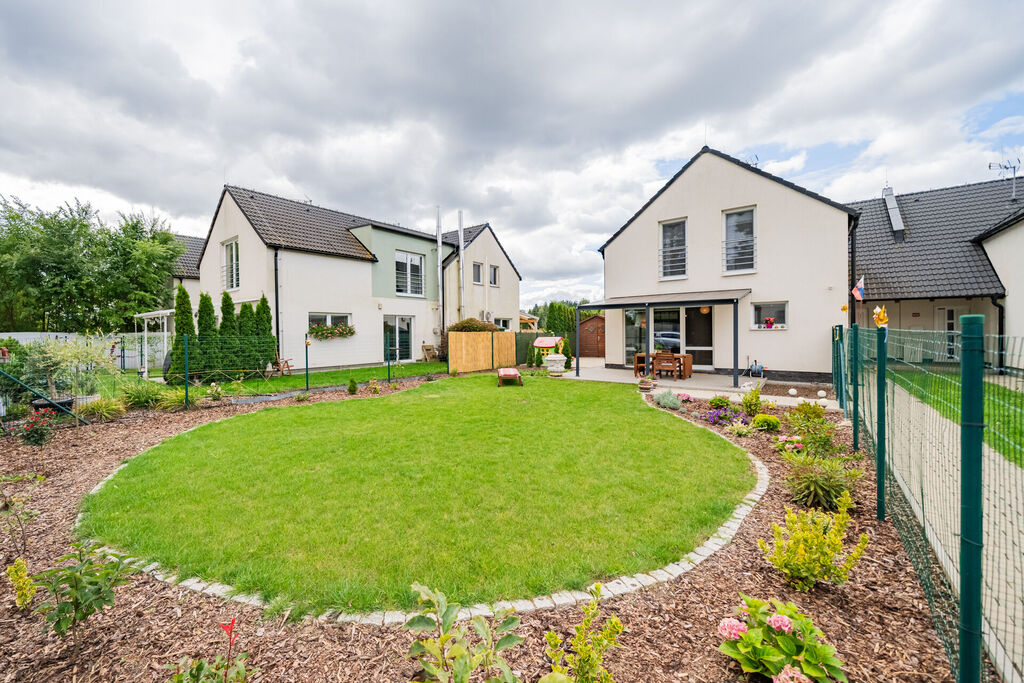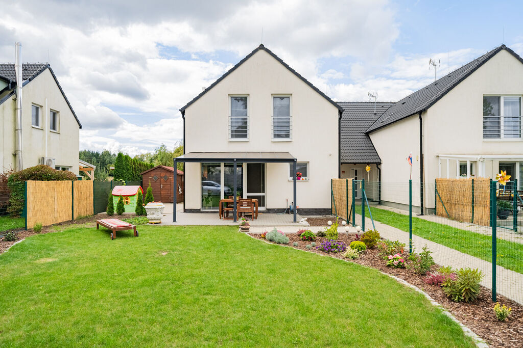 Obývací pokoj v přízemí domu s přímým vstupem na terasu a dále do zahrady, je moderně propojený s kuchyní. Ta je vybavena kuchyňskou linkou na míru se spotřebiči a je zde praktická úložná komora. V přízemí bytu je také vstupní chodba a toaleta. V patře domu jsou dva pokoje, krásná ložnice a druhý pokoj, který je v současné době rozdělen na dva, dětský pokoj a pracovnu. Koupelna je s vanou a toaletou, nechybí připojení na pračku. Topení je řešené elektrickým kotlem. Okna jsou plastová se žaluziemi. Velkou výhodou bytu je klidné bydlení, již zmiňovaná krásná, rovinatá zahrada a skvělá dostupnost Prahy či blízkých Hostivic. Parkování je pohodlné před domem.