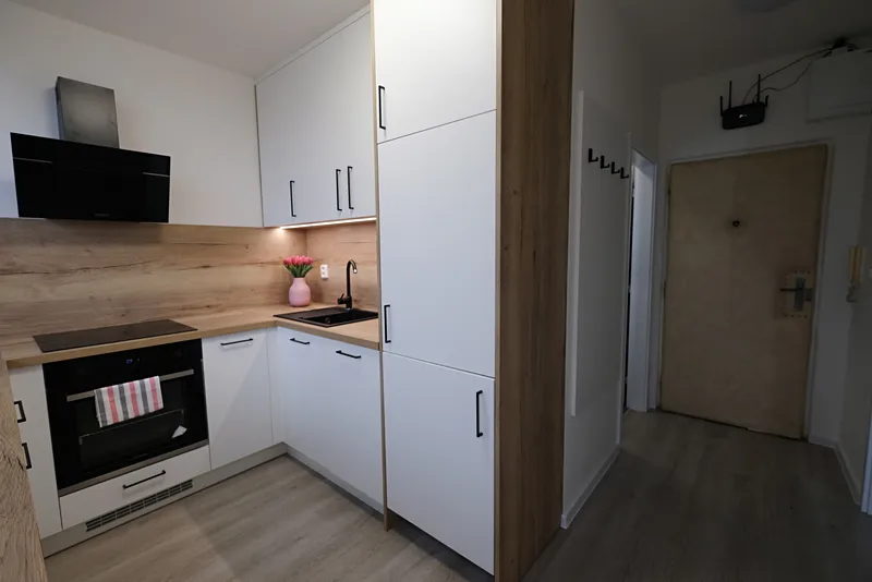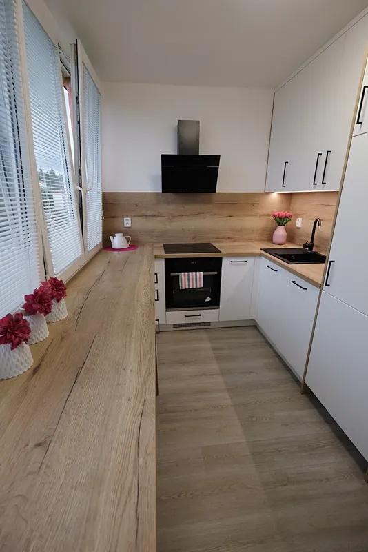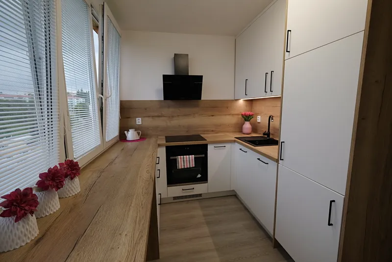 Nabízíme krásný, slunný byt o velikosti 1+1 po kompletní rekonstrukci, který se nachází v 8.NP panelového domu v Uherském Brodě - sídliště 1.máje. Dispozičně se jedná o vstupní chodbu, kuchyň s novou kuchyňskou linkou na míru a s vestavěnými spotřebiči (indukční varná deska, horkovzdušná trouba, digestoř, myčka, pračka, lednice s mrazákem) Dále pokoj navazující na šatnu s vestavěnou skříní. Koupelna se sprchovým koutem a toaletou. Jsou zde nové rozvody elektřiny, odpady, podlahy - vinyl, plastová okna, nové interiérové dveře včetně obložek. K bytu náleží sklep. Jedná se o byt v osobním vlastnictví s měsíčními náklady 2.500,-Kč + inkaso. Bytový dům je po celkové revitalizaci. Jedná se o příjemné bydlení v dosahu obchodu, základní a mateřské školy, dětského hřiště, kina a zastávky MHD. Byt je vhodný i jako investiční a momentálně se pronajímá s vynikajícími nájemníky.
