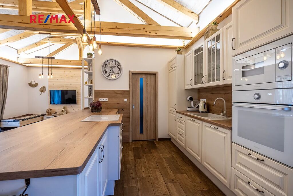 Dominantou domu je prostorná kuchyně propojená s obývacím pokojem, kde vás na první pohled zaujme otevřený strop s přiznanými krovy a decentním podsvícením, které vytváří útulnou atmosféru. V kuchyni byl použit masiv, což zajišťuje nejen vysokou kvalitu, ale i nadčasový vzhled. Celý dům je orientován na jih, což zaručuje dostatek přirozeného světla po celý den. V každém pokoji jsou francouzské dveře a je tak možné projít na zahradu přímo z pokoje, či ložnice.