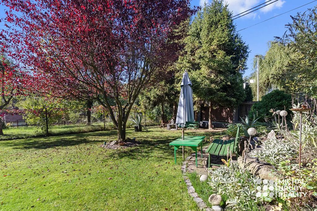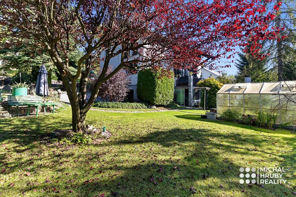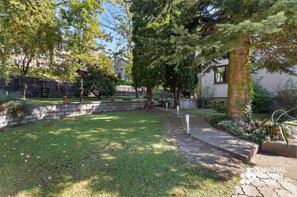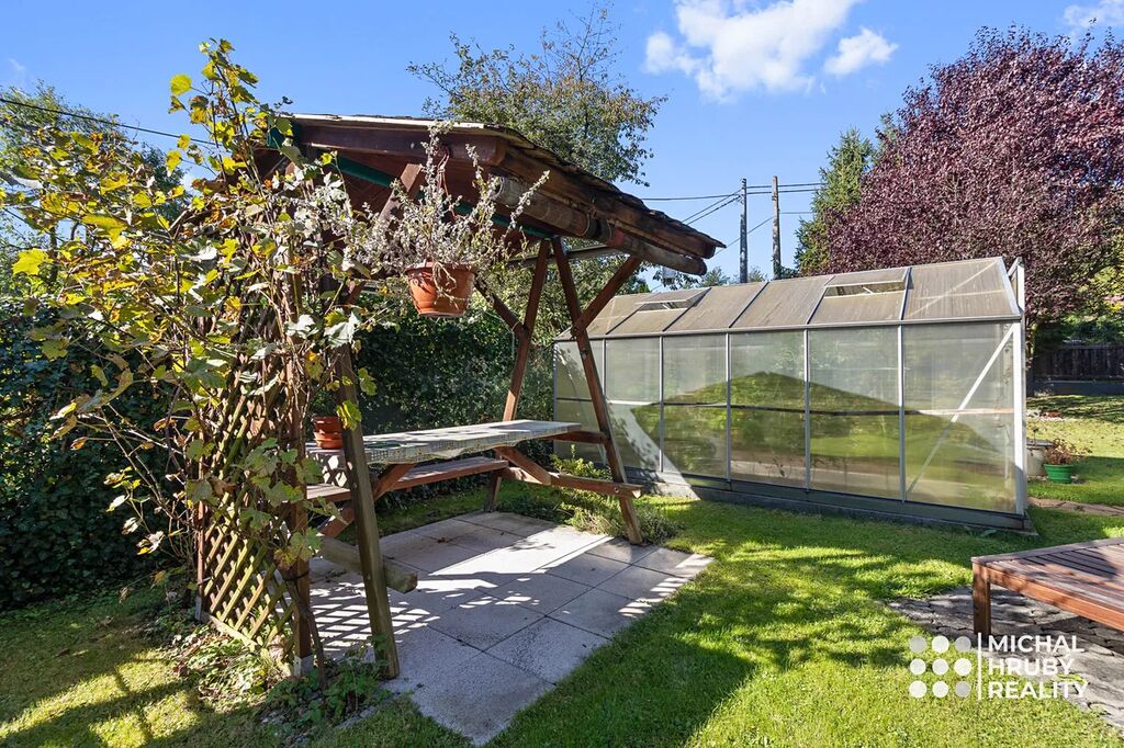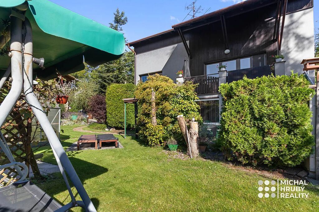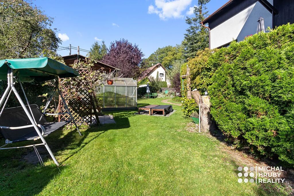 Zahrada je naprosto rovná, má 638 m2 a je rozdělena na několik funkčních částí. Najdete zde místo pro odpočinek, užitkovou část i zákoutí s krbem, kde můžete relaxovat. Postavit si můžete i bazén a pokud toužíte po soukromí, oceníte venkovní pokoj pod terasou domu. O sousedech skoro nebudete vědět, a navíc vám nic nebude rušit výhled třeba na Emu.