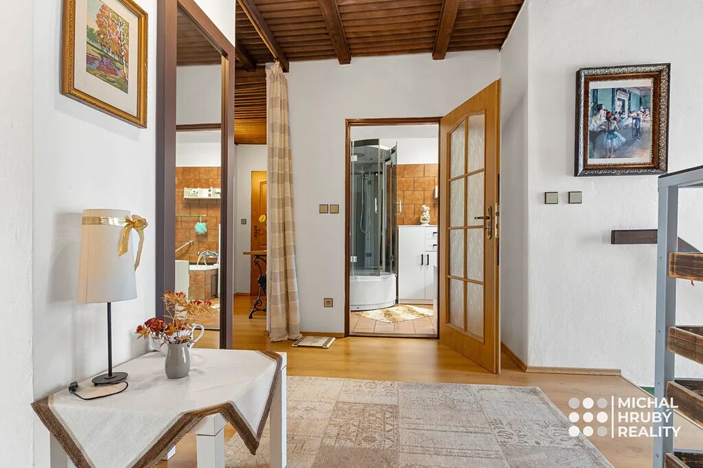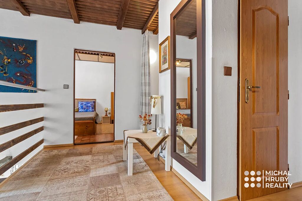 V horním patře jsou celkem tři samostatné neprůchozí pokoje (cca 19 m2 každý), v ložnici je navíc balkón s výhledem na zahradu. Prostorná koupelna, samostatná toaleta i půdní prostor.
