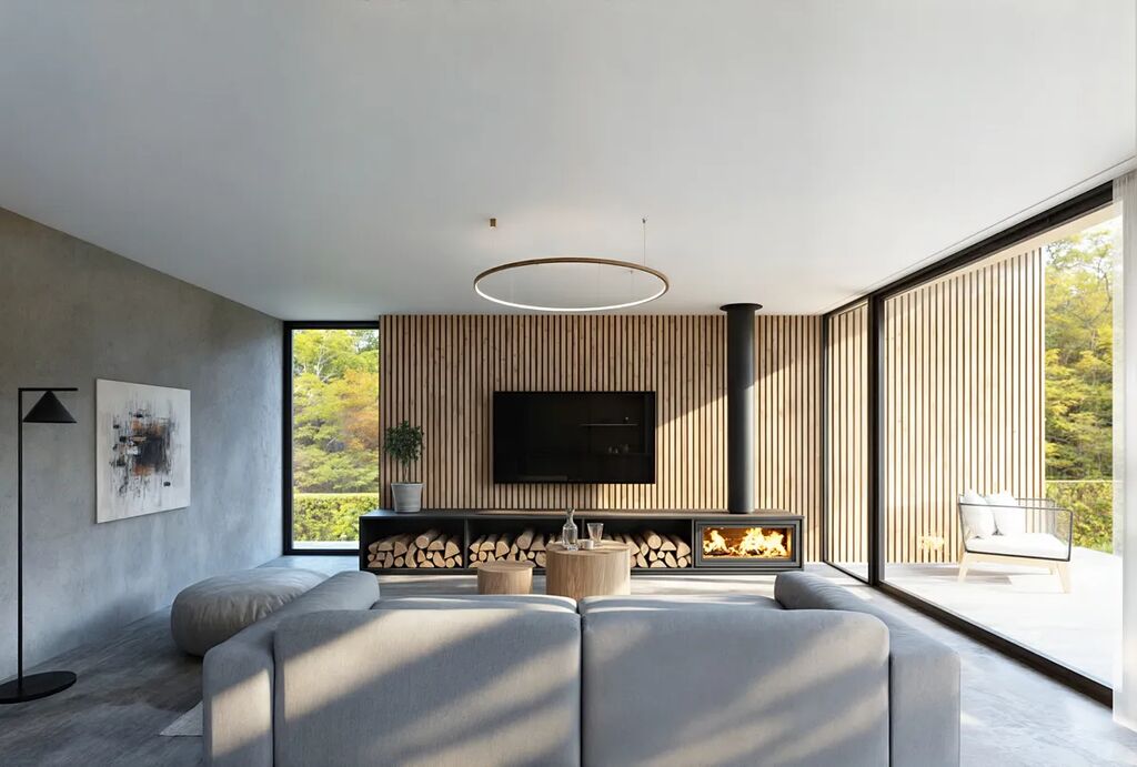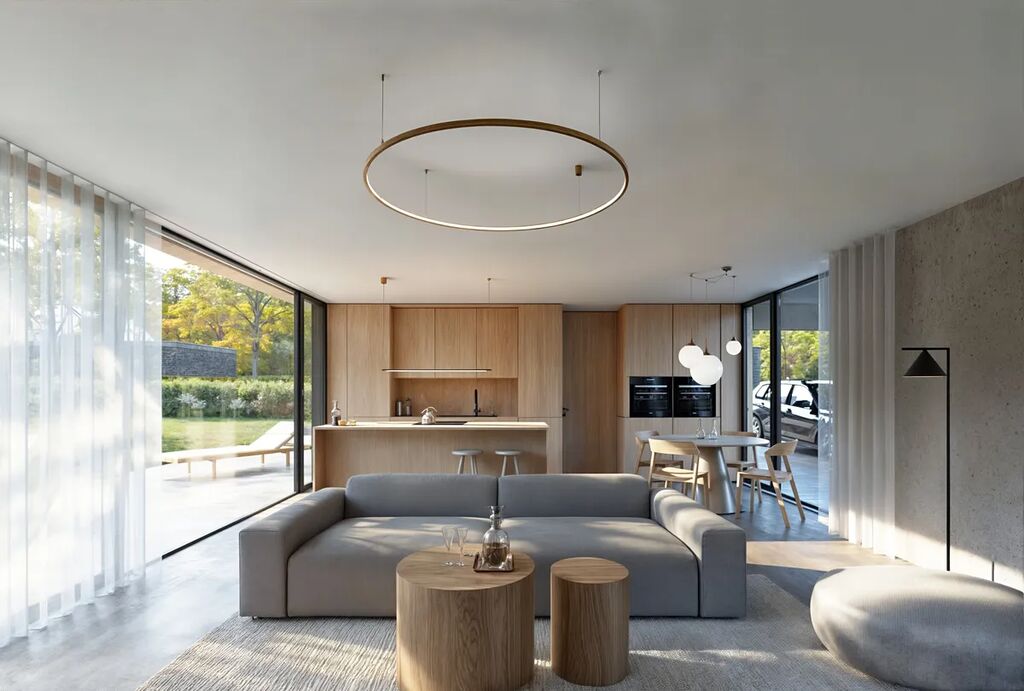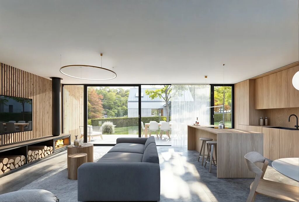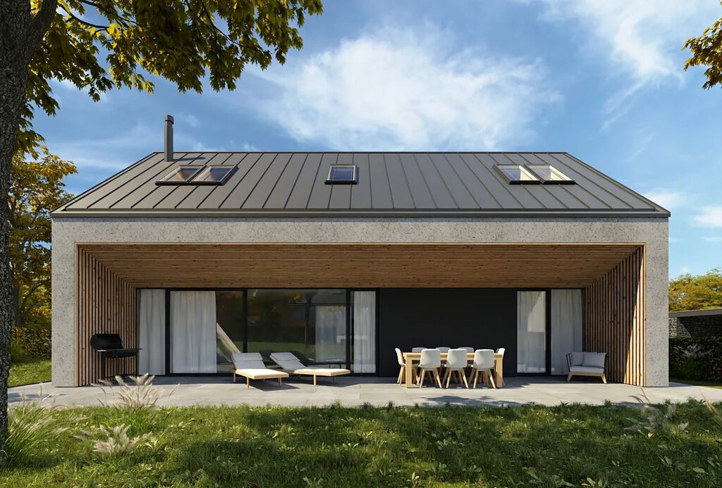 Dům poskytuje funkčnost a praktičnost, vyznačuje se čistými liniemi, elegantní kombinací fasádních, dřevěných a kamenných prvků a precizním zpracováním detailů. Jeho minimalistický design se sedlovou střechou a velkoformátovými výplněmi přináší nejen nadčasový vzhled, ale také dostatek přirozeného světla do interiéru.