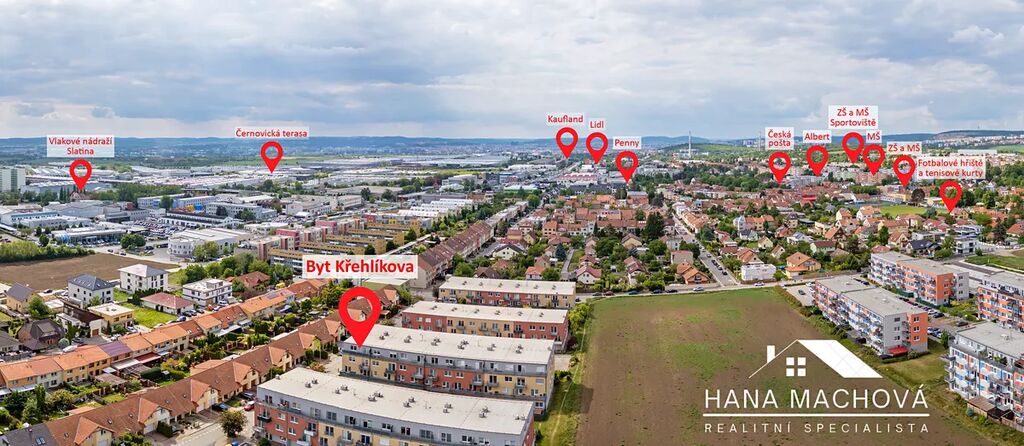 Nabízíme k pronájmu byt s terasou, sklepem a vyhrazeným parkovacím stáním na ulici Křehlíkova v Brně-Slatině. Byt o dispozici 2+kk a ploše 51 m2 se nachází ve 3.p/3 bytového domu z r. 2013. Dům je nízkopodlažní, tedy bez výtahu. Výhodou je naopak kamerový systém, který se v domě stará o vaši bezpečnost. Samotný byt se pronajímá částečně zařízený vč. klimatizace a nabízí dva neprůchozí pokoje, přičemž obývací pokoj s kuchyňským koutem a terasou je orientovaný na jihovýchod, ložnice pak na jihozápad. K bytu náleží v přízemí domu umístěná sklepní kóje a vyhrazené parkovací stání, které se nachází za domem na 50 metrů vzdáleném vyhrazeném parkovišti. Zaparkovat auto je možné také v ulici.