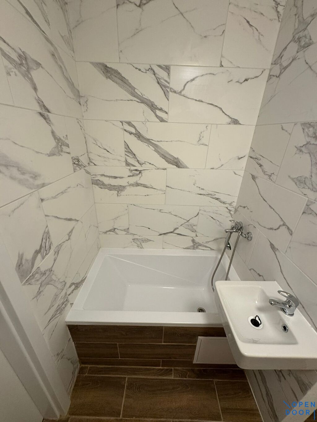 V koupelně je usazená vana se sprchou a je společná s toaletou, oddělená příčkou pro dostatek soukromí.