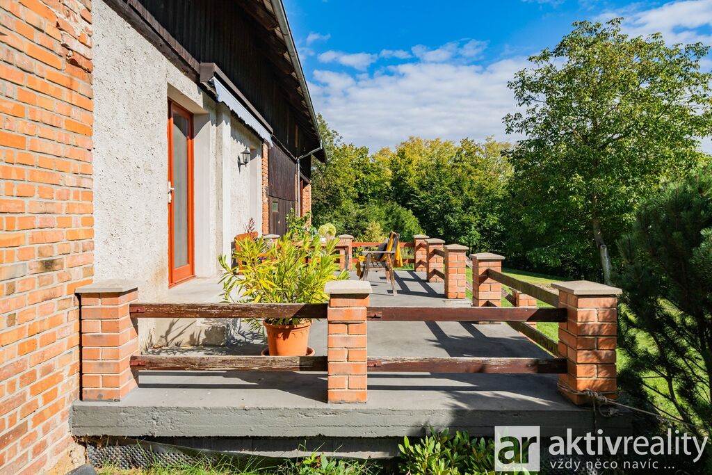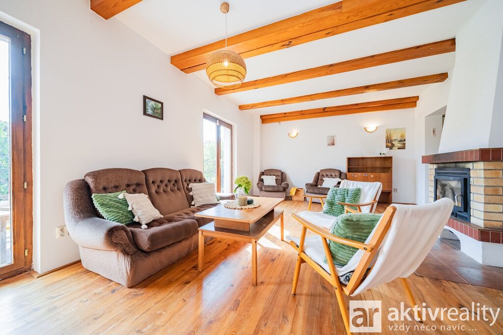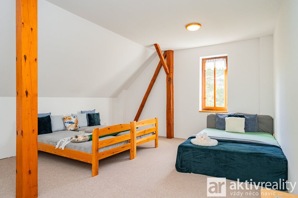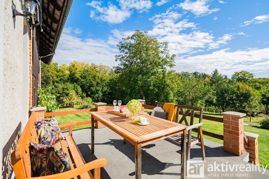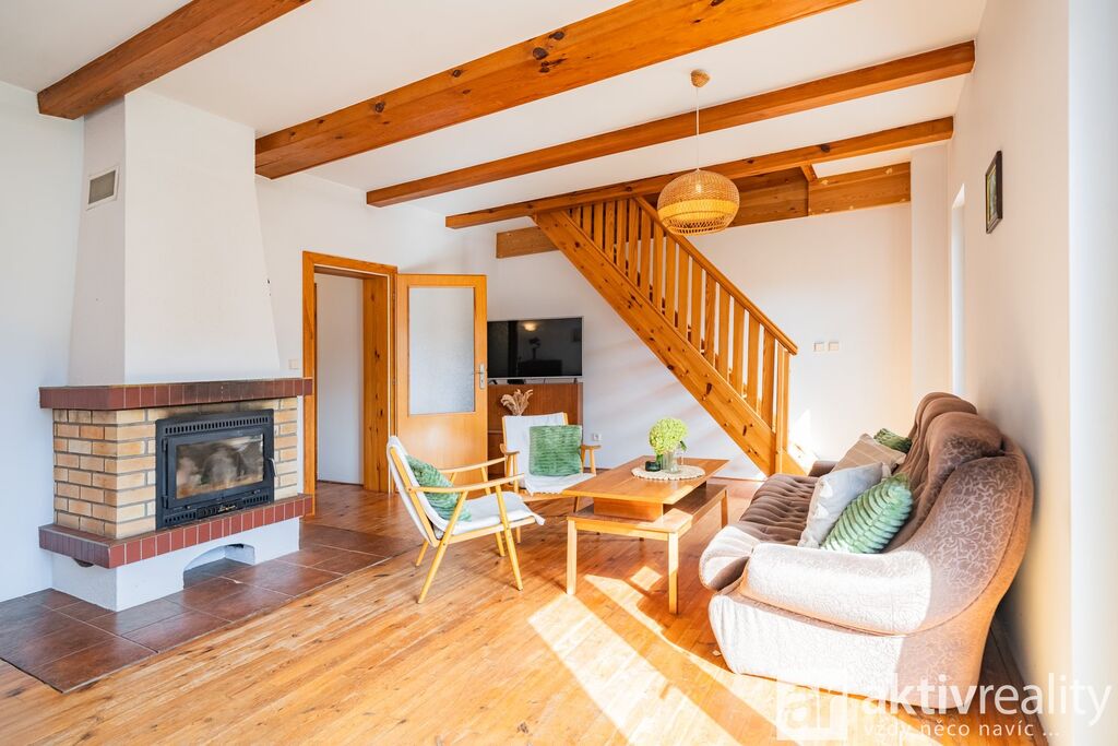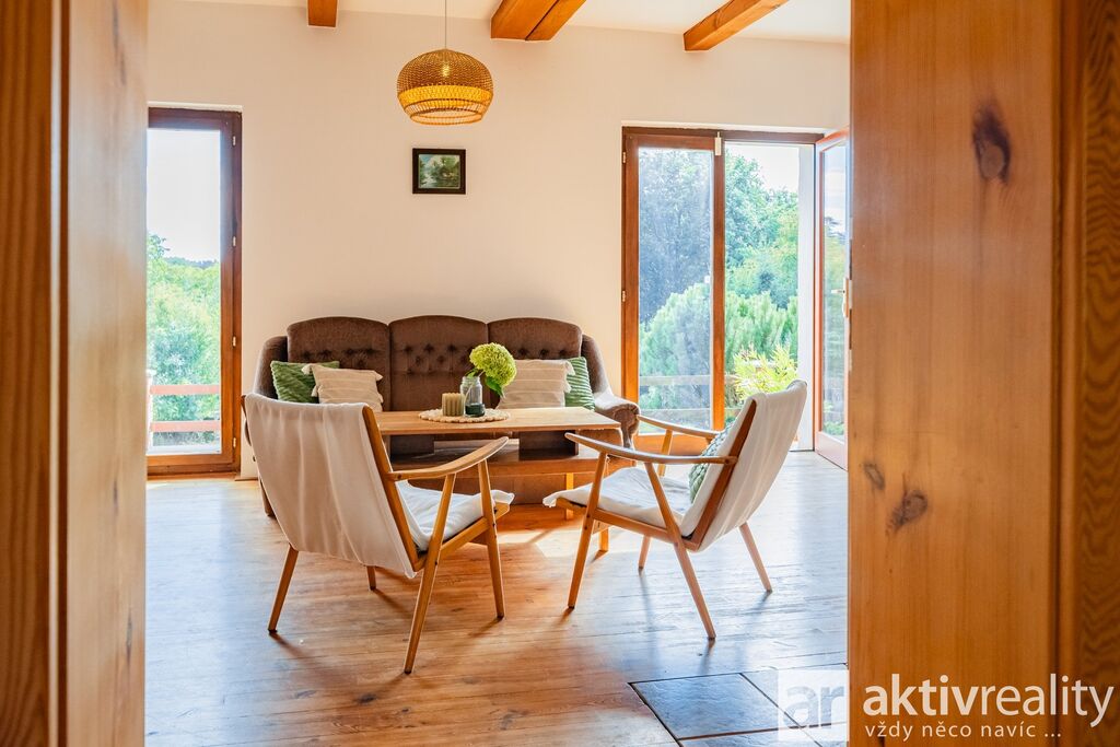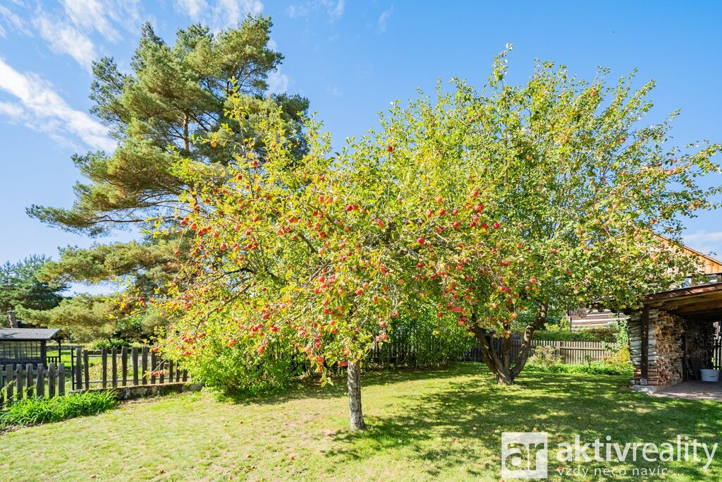 Prodej rekreačního objektu, který majitelé citlivě vestavěli do původní stodoly v obci Dobřeň na Kokořínsku. Okouzlí klidem, soukromím a opravdu velkou vlastní zahradou. Ve stodole navíc zbývá prostor pro další vestavbu či rozšíření stávající části, což je v této lokalitě vzácná možnost. Více podrobností o této nabídce najdete na webu viz video. Vestavba z roku 2006 stojí na vlastních pozemcích o rozloze více než 4 000 m². V přízemí je světlý obývací pokoj se dvěma francouzskými okny a přímým výstupem na jižní terasu, navazuje samostatná kuchyně s místem pro velký jídelní stůl a koupelna se sprchovým koutem, umyvadlem, WC a prostorem pro pračku či sušičku. Dřevěné schodiště vede do podkroví se dvěma prostornými pokoji a samostatnou toaletou. V suterénu je úložné zázemí a sauna. Do interiéru se vstupuje vraty přes stodolu, což hezky podtrhuje charakter místa. Slunná jižní terasa je podsklepená (další úložný prostor) a stíněná výsuvnou markýzou. Podél kratší strany navazuje velký přístřešek se vjezdem z příjezdové cesty a ohništěm s komínem. Zahrada se za terasou mírně svažuje do udržované zeleně s ovocnými stromy a částečně přechází do menšího vlastního lesíku. Na trávníku je připravené srovnané místo pro nadzemní kruhový bazén. Vestavba je z pórobetonových tvárnic se zateplením a s respektem k původní konstrukci. Vytápění zajišťuje krb s teplovzdušnými průduchy, v koupelně žebříkový radiátor. Voda je z obecního vodovodu, odpad sveden do jímky. Zabezpečení Jablotron, internet spolehlivě přes 5G (případně telefonní lince). Více podrobností o této nabídce najdete na webu viz video.