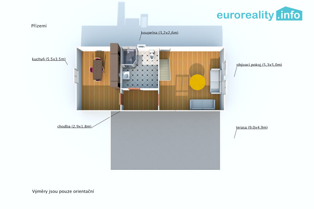 Dispozice přízemí je 2+kk plus koupelna vybavená sprchovým koutem a WC. V patře jsou další dva pokoje a samostatné WC, což zvyšuje pohodlí a soukromí pro všechny členy domácnosti. Dům je ve velmi dobrém stavu a je připraven k okamžitému nastěhování.