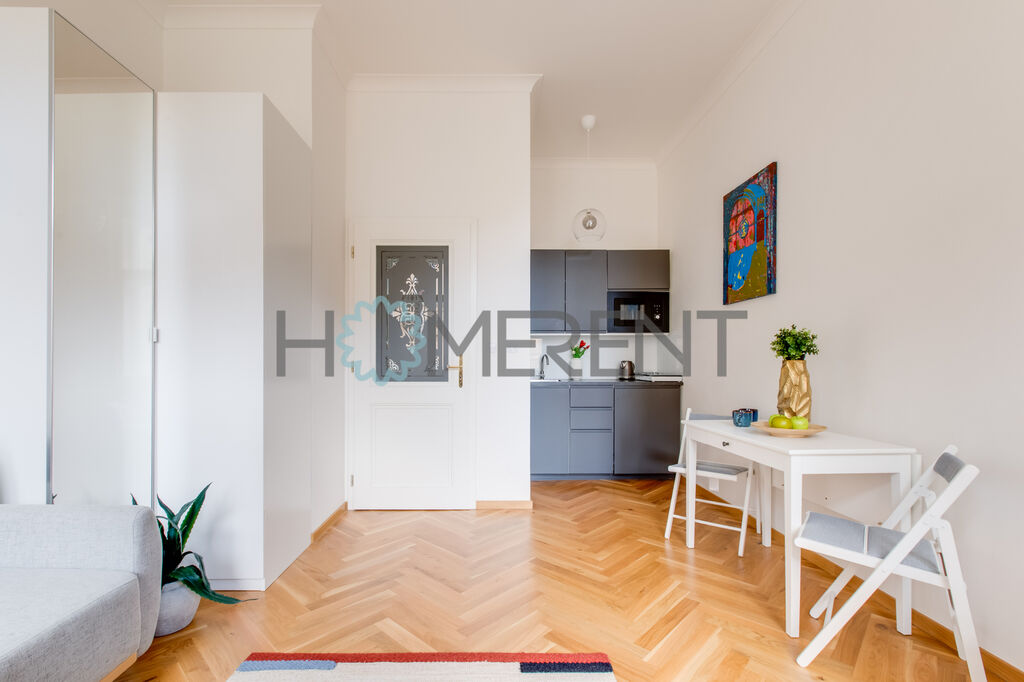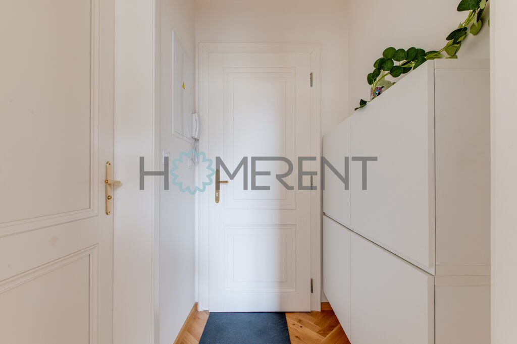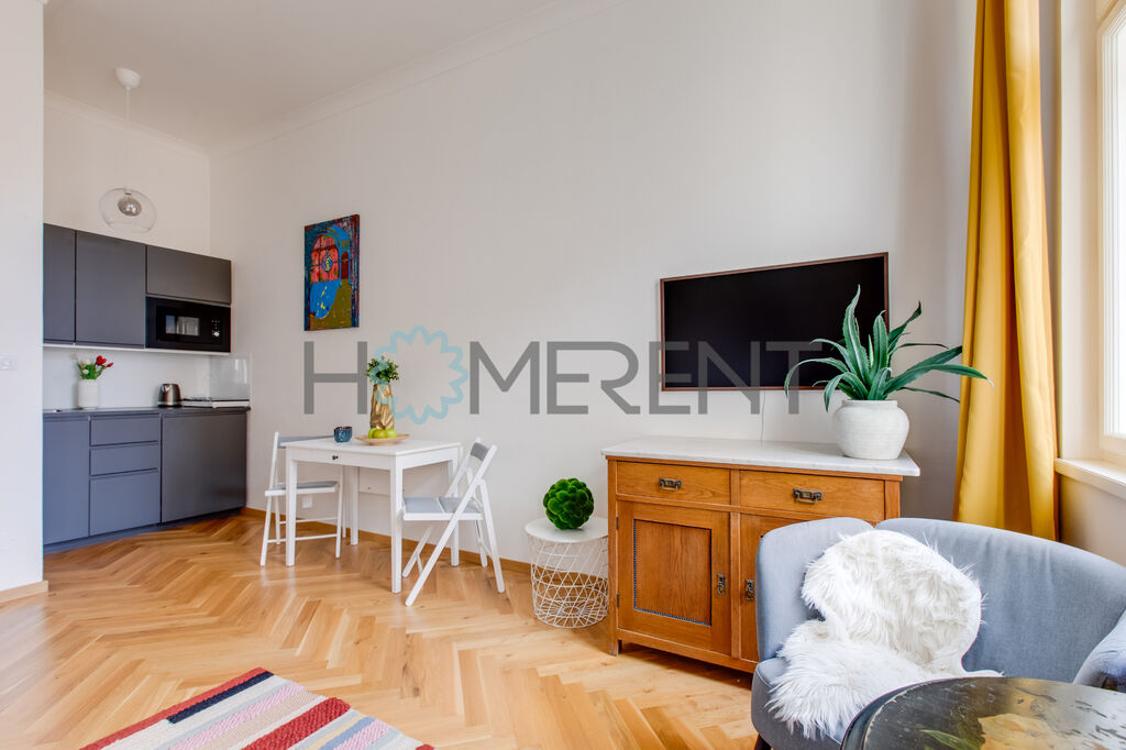 Světlý interiér s nádhernými parketami působí vzdušně a elegantně. Hlavní místnost kombinuje pohodlný obývací prostor s rozkládacím gaučem, na kterém si užijete nejen odpočinek, ale i klidný spánek. Kuchyňský kout je menší, ale promyšleně zařízený tak, abyste měli vše po ruce. Moderní koupelna je vybavená kombinovanou pračkou se sušičkou a doplňuje dojem praktického i estetického zázemí. Nechybí ani šikovné úložné prostory v předsíni. K dispozici je také sklep o velikosti 3 m².