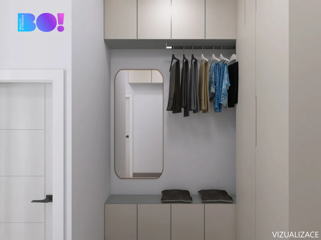 V předsíni je vestavěná skříň připravená na pračku a sušičku, hned u vstupu do kuchyně praktický kumbál na úklidové potřeby a nad vstupem úložný prostor třeba na sezónní věci. Kuchyň je plně vybavena – myčka, trouba, varná deska, lednice i dřez. V ložnici je k dispozici prostorná vestavěná skříň. Zbylý nábytek, který je viditelný na vizualizacích nebude součástí bytu.