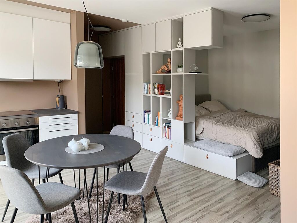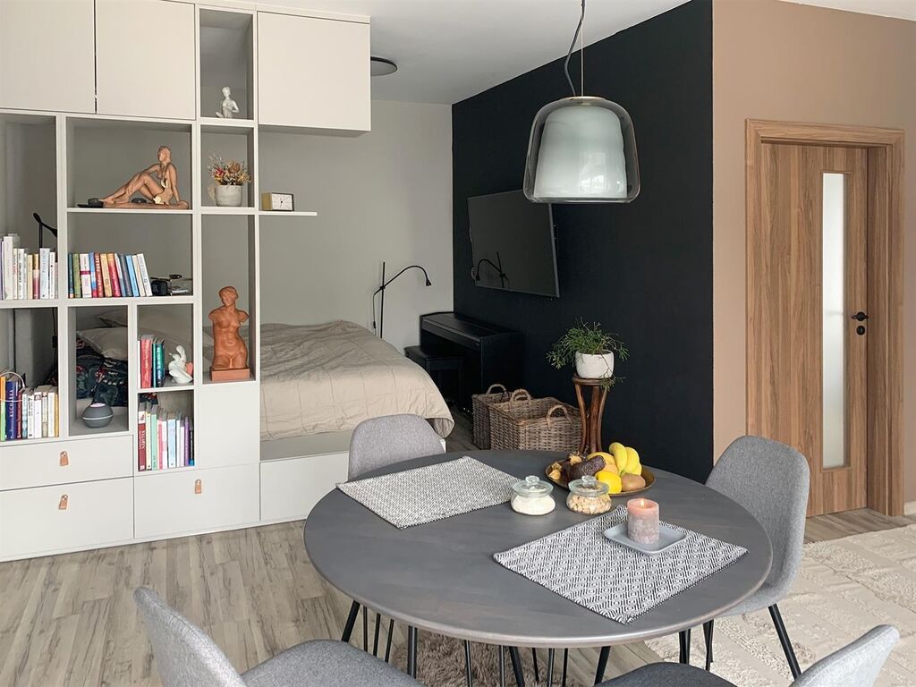 Kuchyňský kout je vybaven na míru dělanou linkou se spotřebiči - varná deska, trouba, lednice s mrazícím boxem, mikrovlnná trouba, digestoř, myčka a jídelním stolem s židlemi. Z této části pokoje je vstup na prostorný balkon o velikosti 5m2, který je orientovaný na západ.