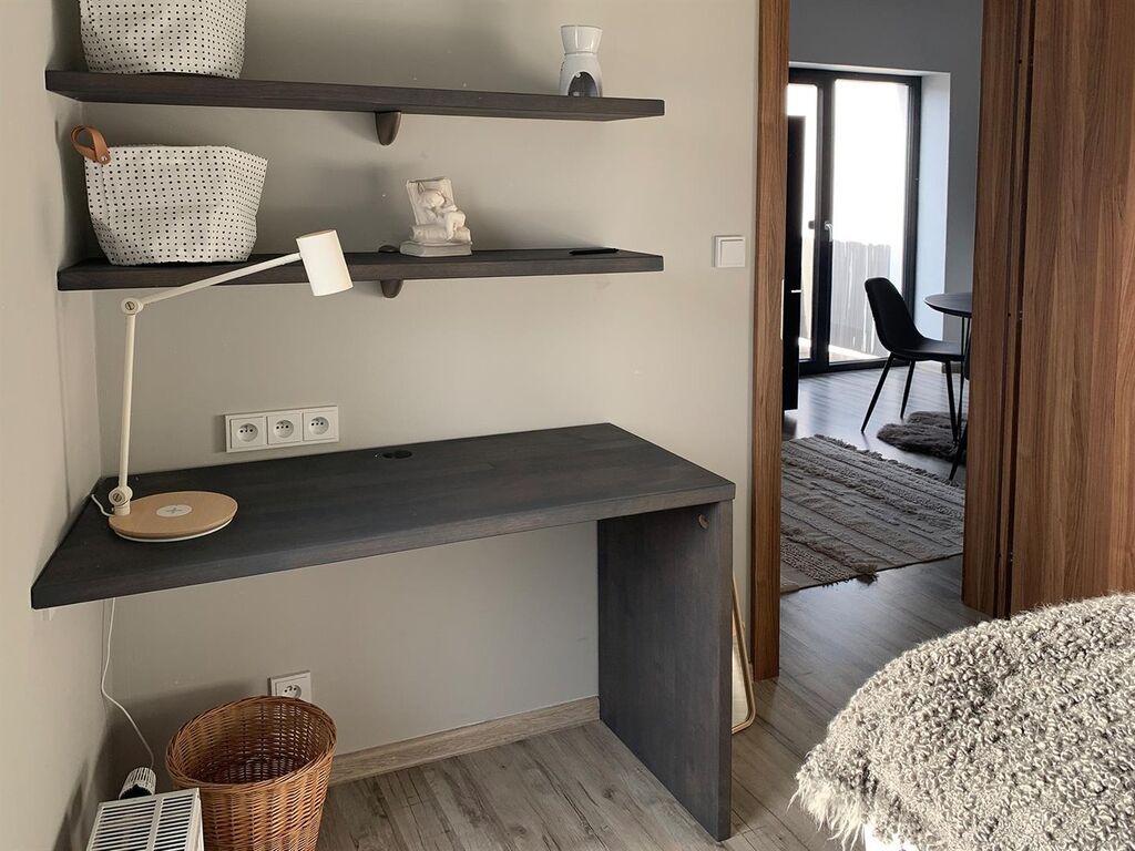 Obývací část pokoje je rozdělena na část pracovní, kde se nachází stůl, židle a část klidovou, která je vybavena manželským dvoulůžkem, širokoúhlou televizí a klimatizací.