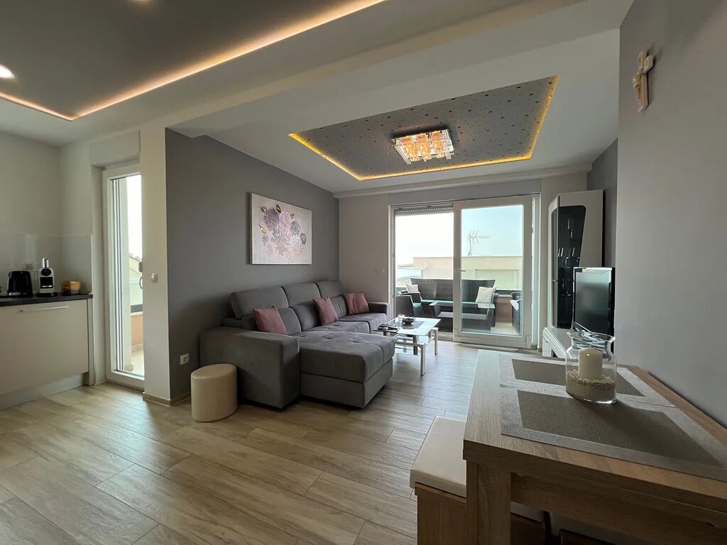 Apartmán o ploše 76,85 m2 sestává z chodby, tří ložnic, koupelny, toalety, balkonu o rozloze 6,20 m2, obývacího pokoje s kuchyní a jídelním koutem s přístupem na prostornou jižně orientovanou lodžii o rozloze 15,30 2 s částečným výhledem na moře. Apartmán je velmi málo využívaný, je kompletně zařízený novým nábytkem a jsou zde i 2 klimatizační jednotky. K apartmánu náleží jedno parkovací místo a garážové stání o rozloze 12 m2 v suterénu budovy.