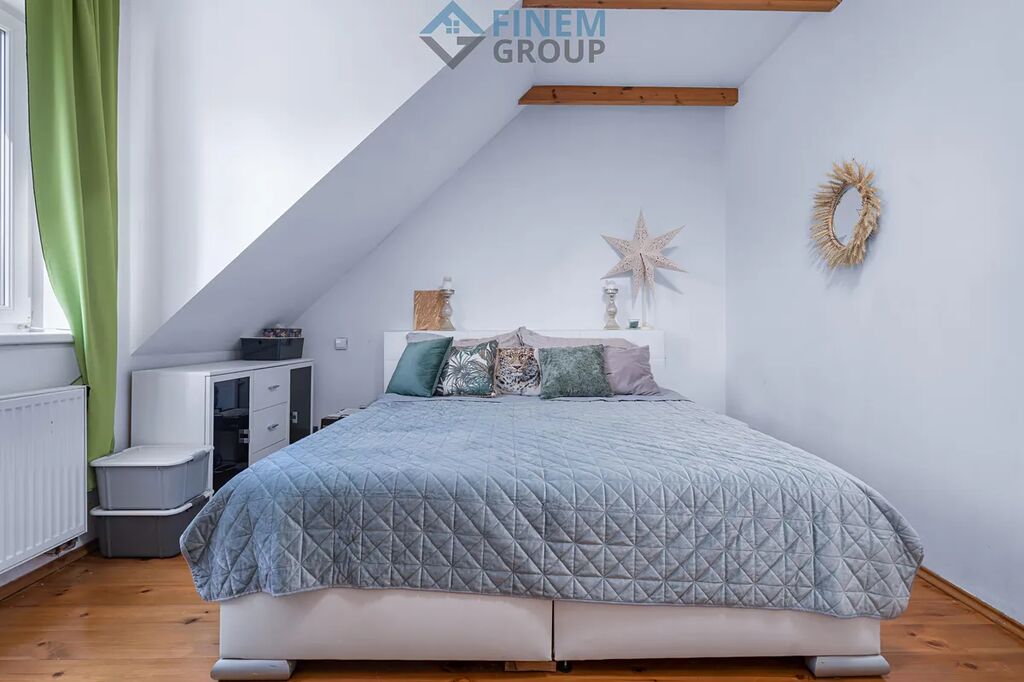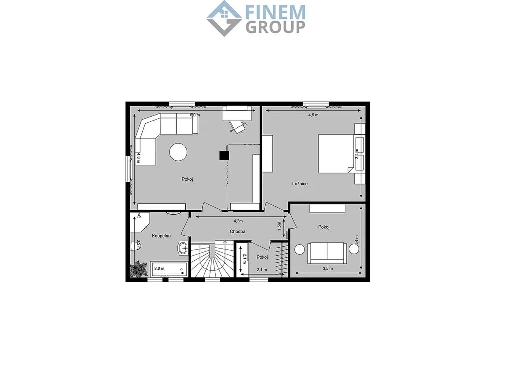 Prostorná vstupní chodba na schodiště do obytné části. Ze schodiště do vstupní haly, odkud vstupujeme do šatny, světlého obývacího pokoje, koupelny a ložnice. Ze vstupní haly vstupujeme do útulné kuchyně, odtud do další ložnice. Dispozice nabízí praktické a zároveň pohodlné propojení všech místností.