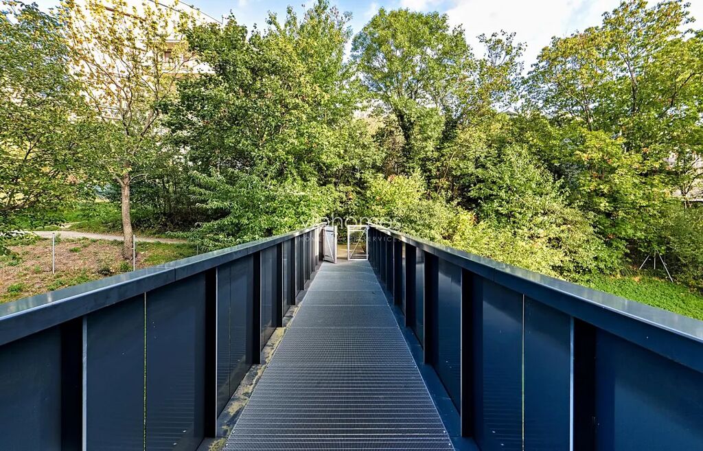 Rezidenční budova je zasazena do zeleně, výhled je naprosto úžasný a prostor okolo domu je velkoryse otevřený. Lávkou v zadní části objektu se dostanete do parku, kde je možné se projít či zasportovat. Před domem je zastávka tramvaje, metro Radlická je 5 minut od domu a dostupnost do centra města je snadná a rychlá.