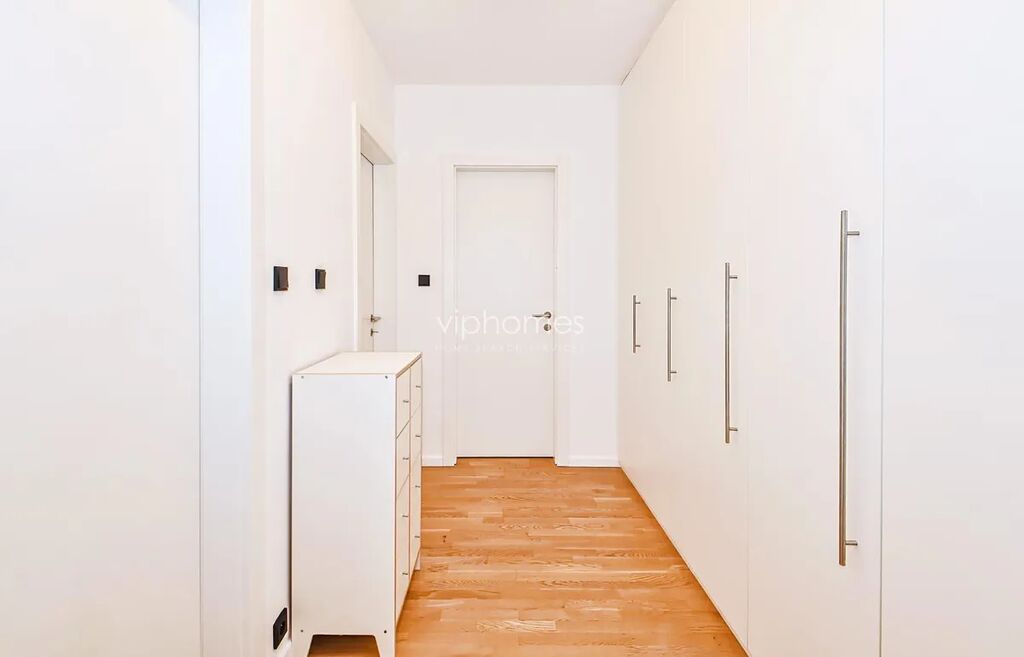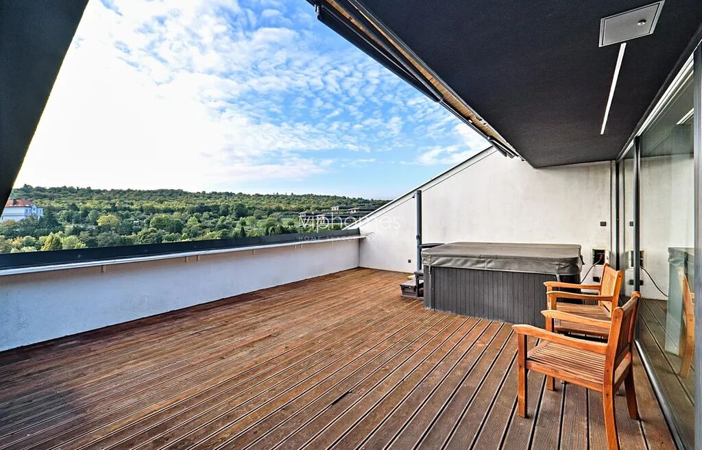 Samotný byt poskytuje ojedinělé bydlení s neobyčejnou dispozicí. Elegantní oddělení zóny obytné a relaxační zajišťuje uživatelům klid a zároveň plné využití obytného prostoru, včetně venkovní terasy v době denní aktivity. Hlavní obytný prostor je spojen s kuchyní, jídelním koutem; velké dveřní okno se vstupem na terasu poskytuje dostatek slunečního svitu. V zimních měsících je zde i domácí lihový krb. Kuchyňská linka je vybavena elektrickými spotřebiči moderního typu. K dispozici jsou 3 samostatné ložnice, 2 designové koupelny – jedna s vanou i sprchovým koutem, druhá se sprchovým koutem. Dále je zde velká prostorná chodba s dostatečným úložným prostorem, místností na pračku a sušičku a WC pro hosty. Hlavní ložnice se vstupem na terasu, šatnou a prostornou koupelnou s WC je orientována na jihozápad. K bytu náleží intimní 45m2 terasa s nádherným výhledem do okolí, orientovaná na jihovýchod. Sklep o velikosti 5 m2 se nachází v 2.patře nikoliv v suterénu domu. Dvě parkovací stání. Ve všech prostorách domu jsou bezpečnostní kamery. Zálohy na elektrickou energii jsou 2.940 KČ.