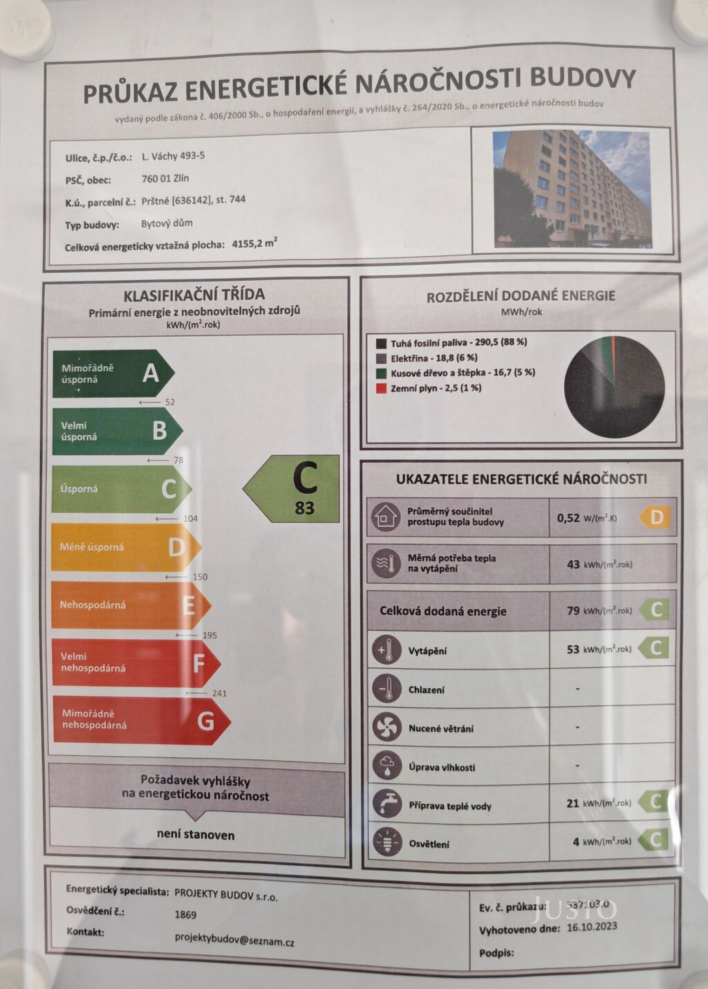 Topení a ohřev teplé vody je dálkové, s měřícími jednotkami na radiátorech v bytě.