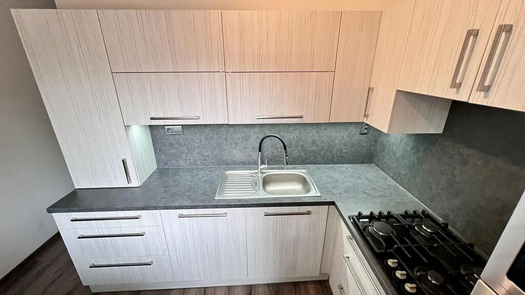 Kuchyň je plně vybavena: kuchyňská linka, plynová varná deska, elektrická trouba, digestoř, myčka na nádobí a dřez s vodovodní baterií vám usnadní každodenní vaření i úklid.